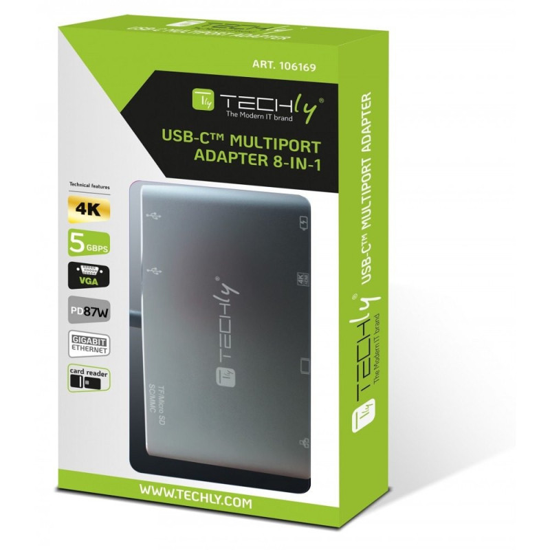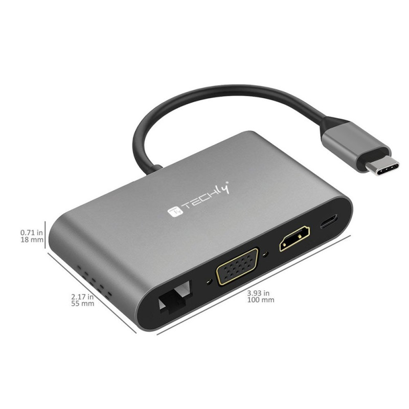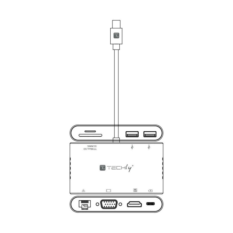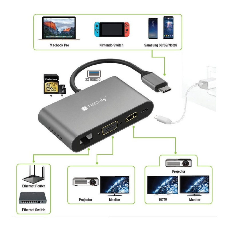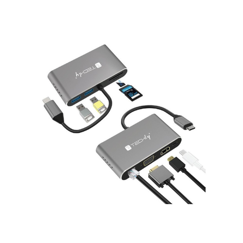 - Adapter USB-C Multiport HDMI/VGA/RJ45/USB-C PD/USB-A/MicroSD/SD