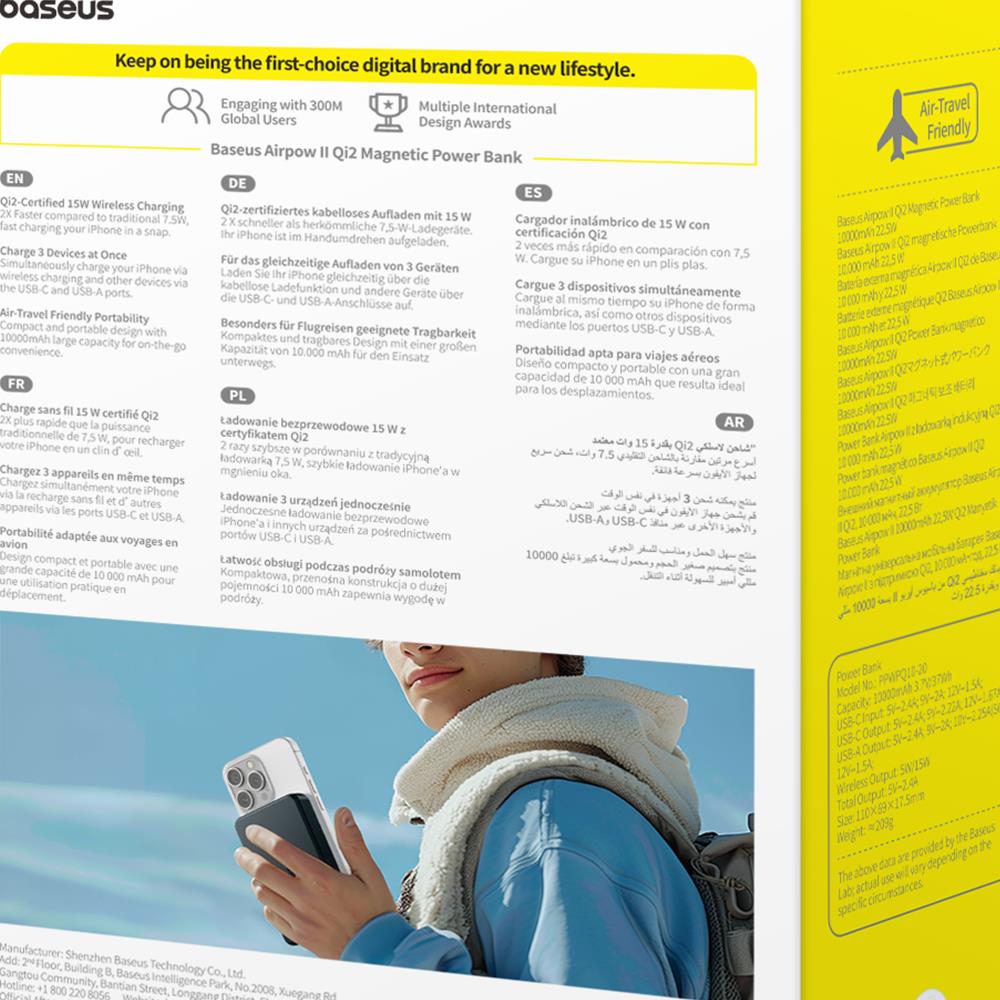 Oprócz bezprzewodowego ładowania 15W, Baseus Qi2 oferuje również wszechstronne opcje ładowania przewodowego – port USB-A o maksymalnej mocy wyjściowej 22,5W oraz USB-C o mocy 20W. Dzięki temu możesz ładować dwa urządzenia jednocześnie. Ważne: funkcje ładowania przewodowego i bezprzewodowego nie mogą być używane równocześnie.