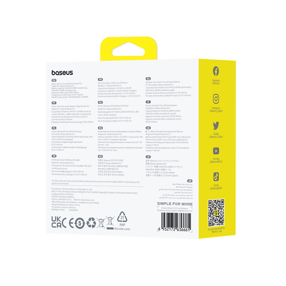 Słuchawki Baseus E13 TWS z etui ładującym. Idealny do słuchania muzyki i spotkań towarzyskich. Etui posiada funkcję ładowania bezprzewodowego. Program pozwalający określić położenie słuchawekIdealne dopasowanie do ucha oznacza, że ??możesz używać zestawu przez cały dzień bez bólu i dyskomfortu. Dzieje się tak dzięki niewielkiej wadze, rozmiarom i ergonomicznemu kształtowi.Choć słuchawki są niewielkie, głośniki mają średnicę 12 mm, co oznacza, że ??grają czystym i głębokim dźwiękiem. Dwukanałowa technologia Low-Latency i połączenie Bluetooth 5.3 pozwoliły zredukować opóźnienie do 0,06 s, co gwarantuje doskonałą synchronizację obrazu i dźwięku. Technologia redukcji szumów dzięki 4 zintegrowanym mikrofonom eliminuje przeszkadzający hałas otoczenia podczas rozmów wysokiej jakości.W pełni naładowane słuchawki działają aż do 7 godzin (do 7 godzin rozmów / do 6 godzin słuchania muzyki), a dołączone etui pozwala wydłużyć ten czas nawet do 30 godzin. Kompaktowe i stylowe etui, bez ładowania, chroni słuchawki przed zgubieniem. Jest wyposażony w nowy port USB-C i funkcję ładowania bezprzewodowego.Przyciski sterujące umożliwiają włączanie/wyłączanie słuchawek, aktywację asystenta głosowego, odtwarzanie/wstrzymywanie dźwięku, odbieranie/kończenie połączeń bez wyjmowania telefonu z kieszeni.Aplikacja mobilna Baseus Smart umożliwia sprawdzenie lokalizacji zestawu słuchawkowego na mapie, ustawienie alertów, gdy zestaw słuchawkowy znajdzie się poza zasięgiem sygnału Bluetooth, a także aktywację sygnału dźwiękowego w celu jego zlokalizowania. Posiada również funkcję przycisku personalizacji. Możesz także zaktualizować swój zestaw słuchawkowy i nadać mu nazwę.