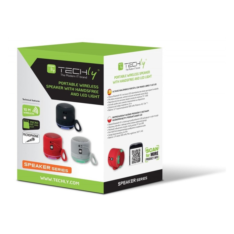 Głośnik BT 5.1 Techly ICASBL94GR, P/N: 363654 – Bezprzewodowy Mini Głośnik Bluetooth True Wireless TWS z Kolorowym Podświetlaniem LED oraz Odtwarzaczem MP3 USB/MicroSD, 5W, Szary