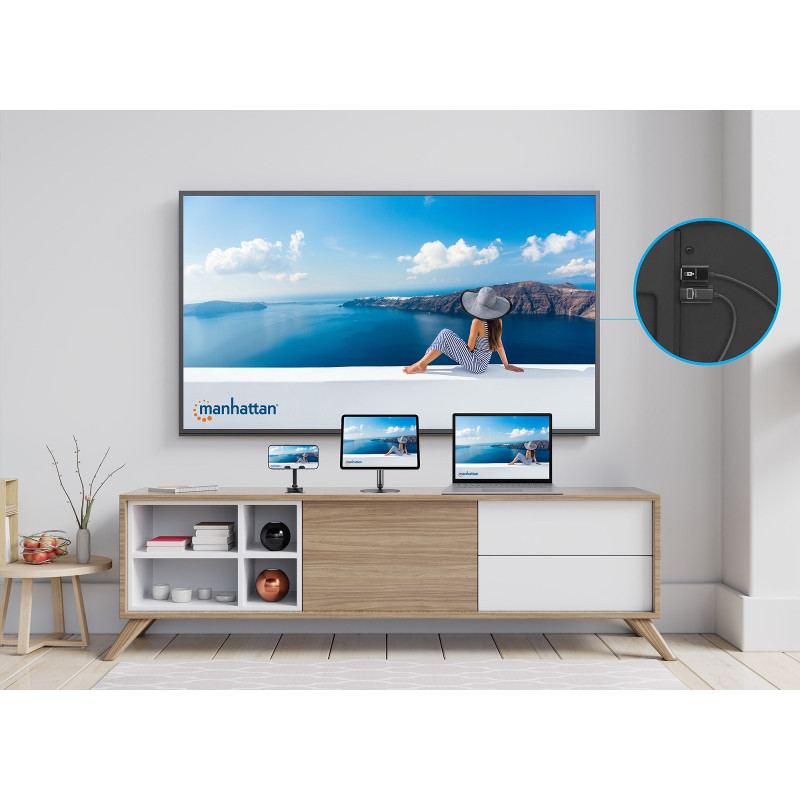 - Bezprzewodowa transmisja video: transmiter wi-fi obrazu z USB-C do HDMI składający się z modułu nadajnika oraz odbiornika pozwala na swobodne strumieniowanie obrazu z urządzenia USB-C do telewizora, monitora lub projektora HDMI w rozdzielczości do 1080p@60Hz oraz na odległość do 30m