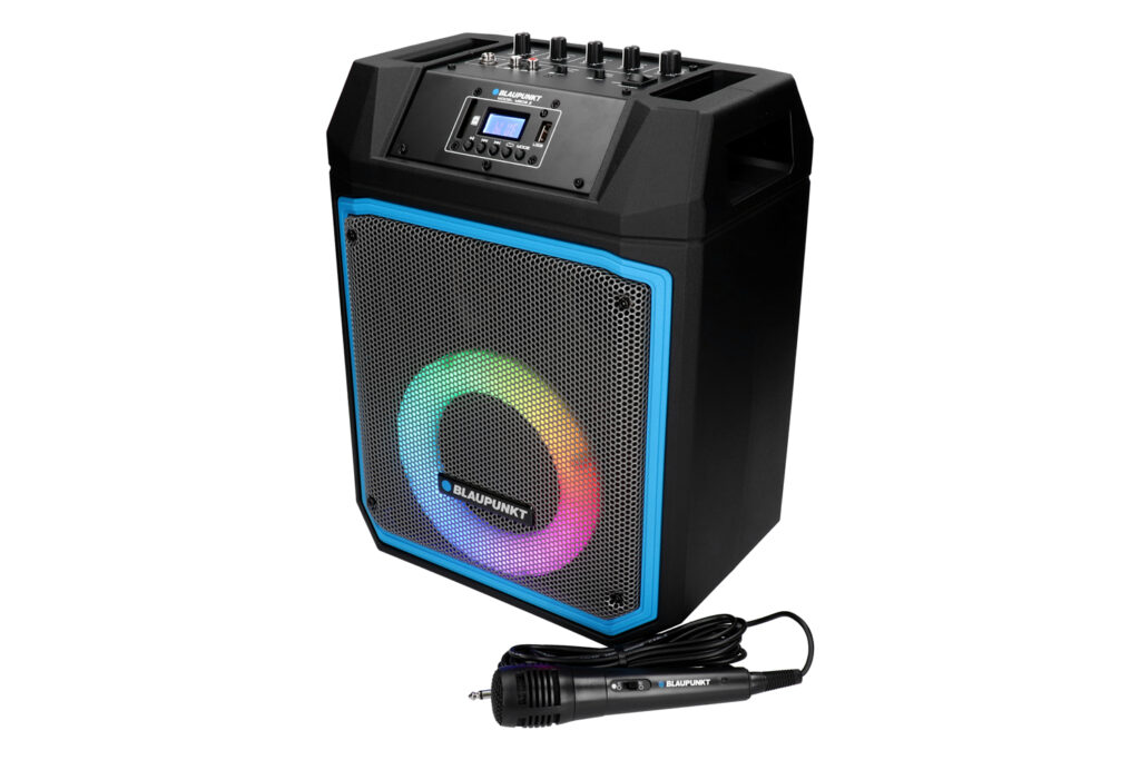 Bluetooth do odtwarzania muzyki poprzez profil audiostreaming (A2DP)#13#10Funkcja bezprzewodowego stereo (TWS)#13#10Odtwarzacz USB/SD (do 32 GB)#13#10Odtwarzanie plików MP3/WMA#13#10Radio FM z pamięcią 99 stacji#13#10Equalizer: Normal, Rock, Pop, Classic, Jazz, News#13#10Funkcja karaoke z mikrofonem w zestawie#13#10Pilot zdalnego sterowania#13#10Wejście AUX#13#10Oświetlenie LED#13#10Całkowita moc muzyczna: 500 W#13#10Zasilanie bateryjne: wbudowany akumulator 12 V 5 Ah#13#10Zasilanie sieciowe: AC 110-240 V~50/60 Hz#13#10Czas pracy na baterii: 3-4 godziny#13#10Czas ładowania: około 5 godzin#13#10Wymiary: 294 (szer.) x 378 (wys.) x 205 (gł.) mm