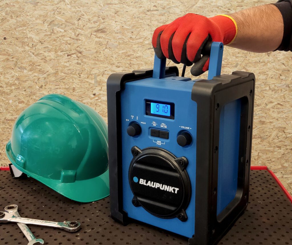 Przenośny radioodtwarzacz budowlany PP30BT JOBSITE marki BLAUPUNKT, posiadający, poza zasilaniem sieciowym, wbudowany akumulator 7,4 V (2200 mAh), sprawdza się w miejscach, w których brakuje możliwości stałego podpięcia pod sieć elektryczną. Długi czas pracy na akumulatorze od 7 do 10 h, wystarczy na cały dzień słuchania muzyki w trakcie pracy.