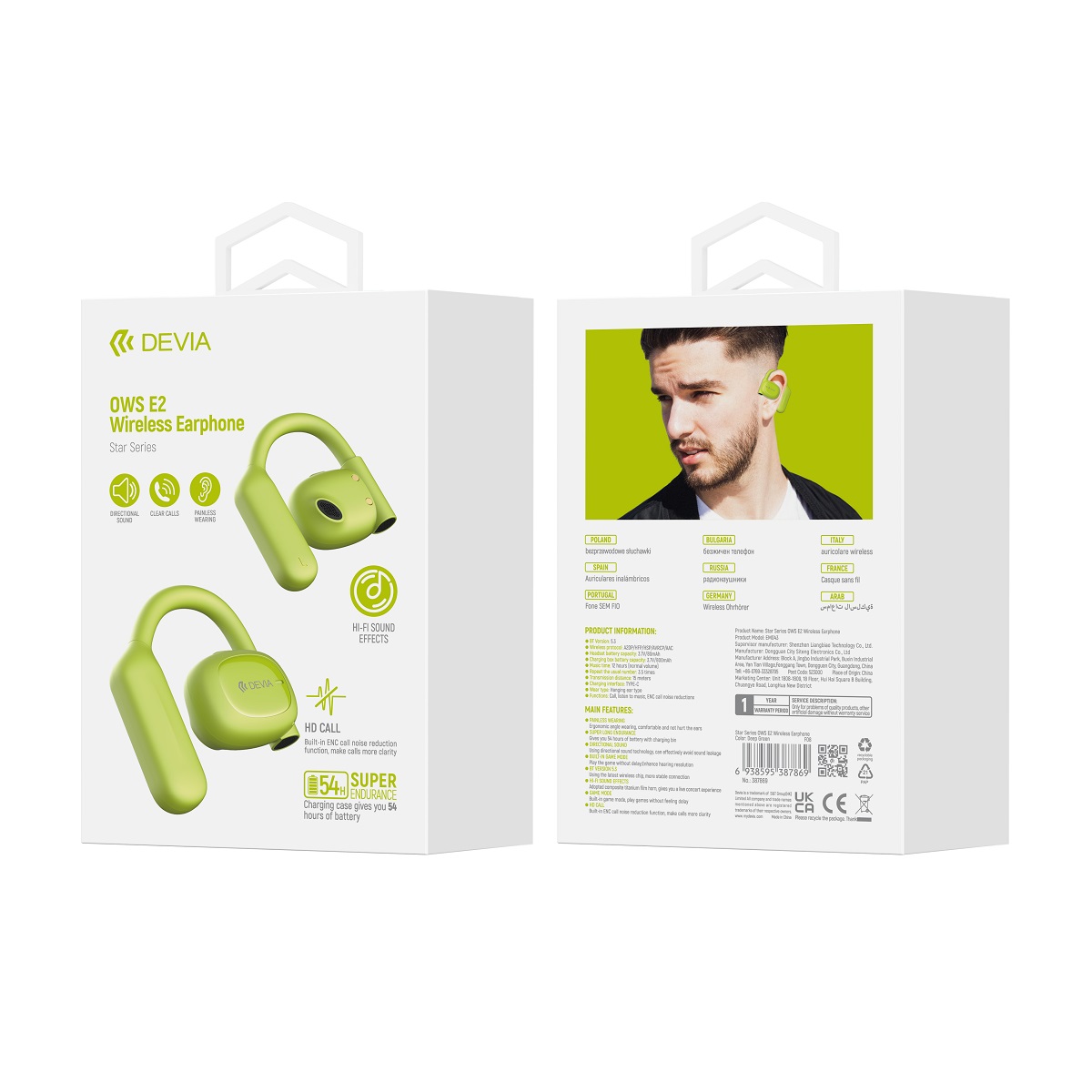 DEVIA Star E2 to nauszne słuchawki Bluetooth 5.3 OWS, wyposażone w przenośne pudełko ładujące. Dzięki technologii OWS (Over-ear Wireless Stereo) obie słuchawki łączą się bezprzewodowo, tworząc wysokiej jakości zestaw stereo.