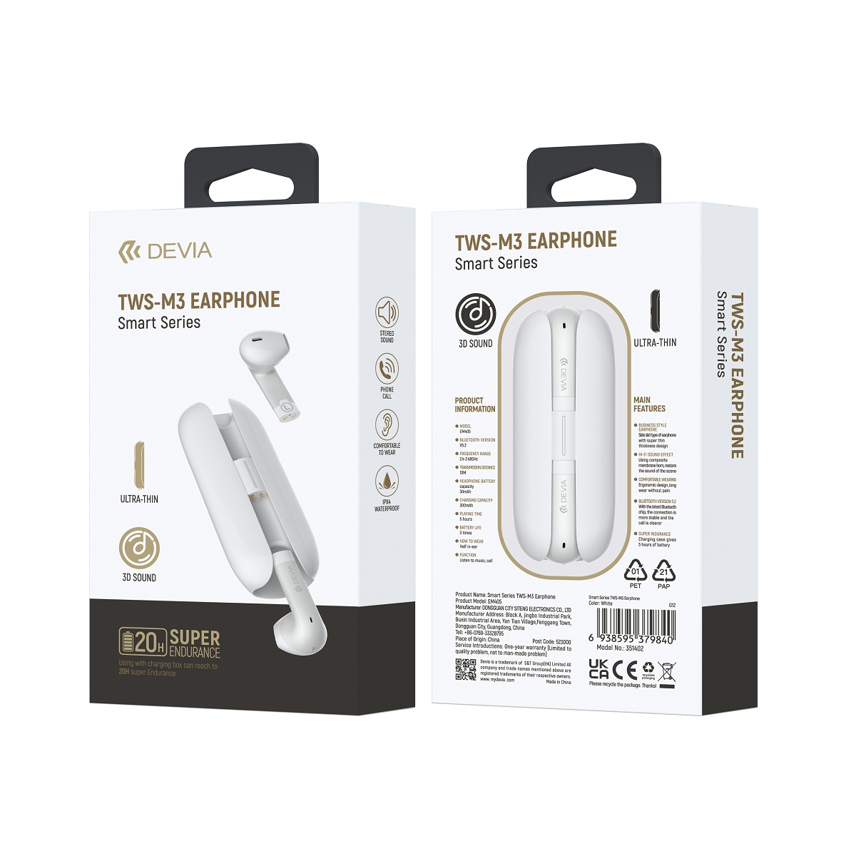 Devia Smart M3 to douszne słuchawki bluetooth 5.2 TWS z pudełkiem ładującym. Słuchawki wspierają technologię TWS (True Wireless Stereo) – obie słuchawki łączą się ze sobą tworząc bezprzewodowy zestaw stereo. Przenośne pudełko z wbudowaną baterią oprócz funkcji ładowania pozwala bezpiecznie przechowywać słuchawki w kieszeni, torbie lub plecaku. Uwolnij swoje ręce i słuchaj muzyki, radia internetowego, podczas pracy, spaceru, treningu czy prowadzenia samochodu. Słuchawki Devia Smart M3 TWS są idealnym rozwiązaniem dla użytkowników smartfonów, komputerów, notebooków, tabletów i innych urządzeń obsługujących technologię Bluetooth. Są kompatybilne z większością urządzeń z systemem Android oraz iOS. Słuchawki posiadają także mikrofon, dzięki czemu bez problemu możesz prowadzić rozmowy głosowe. Czas trwania rozmów/ słuchania muzyki na pełnym naładowaniu wynosi około 300 minut (w zależności od poziomu głośności), dzięki wykorzystaniu energooszczędnej technologii Bluetooth 5.2.
