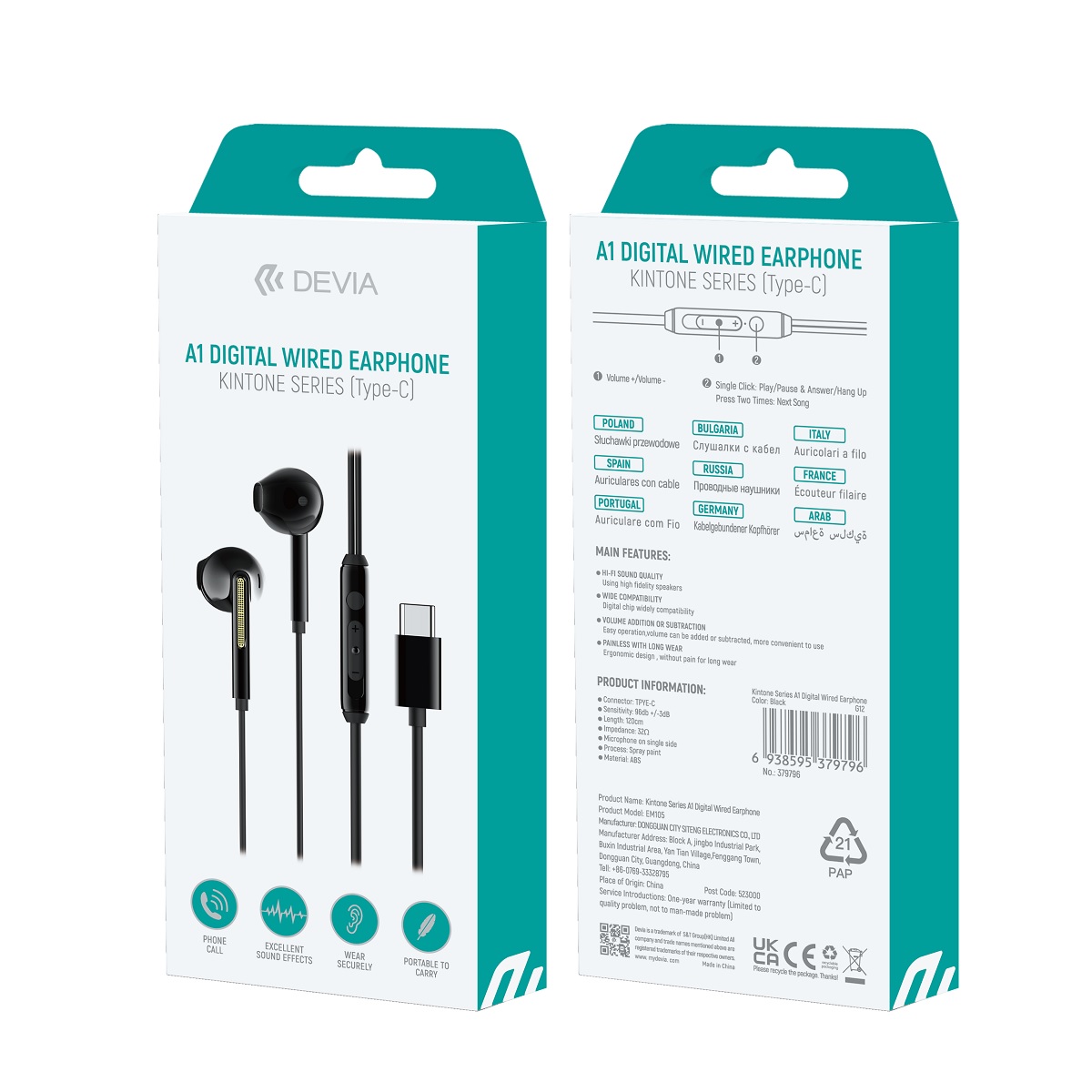 Devia Kintone A1 to dokanałowe słuchawki przewodowe do smartfonów wyposażonych w gniazdo USB-C i nie wyposażonych w gniazdo jack 3,5mm. Przewód wykonany z elastycznego silikonu zapewni jak najdłuższy czas użytkowania.