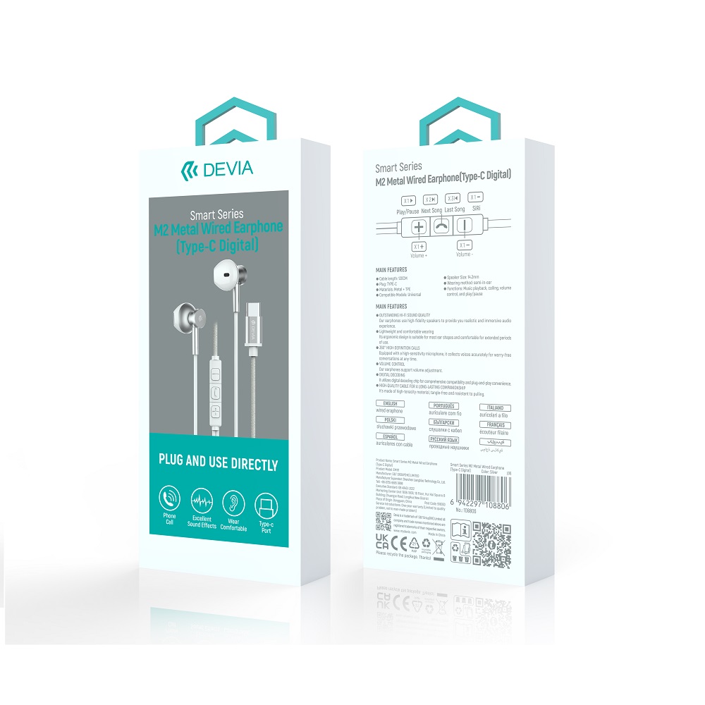 Słuchawki Devia Smart M2 Metal to dokanałowe słuchawki przewodowe pasujące do urządzeń, które posiadają gniazdo USB-C i nie posiadają gniazda jack 3,5 mm.
