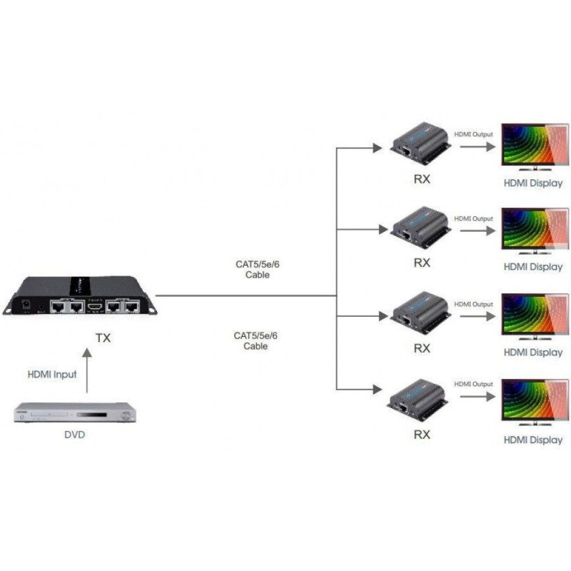 - Umożliwia transmisję po skrętce sygnału HDMI z urządzenia źródłowego do czterech odbiorników jednocześnie