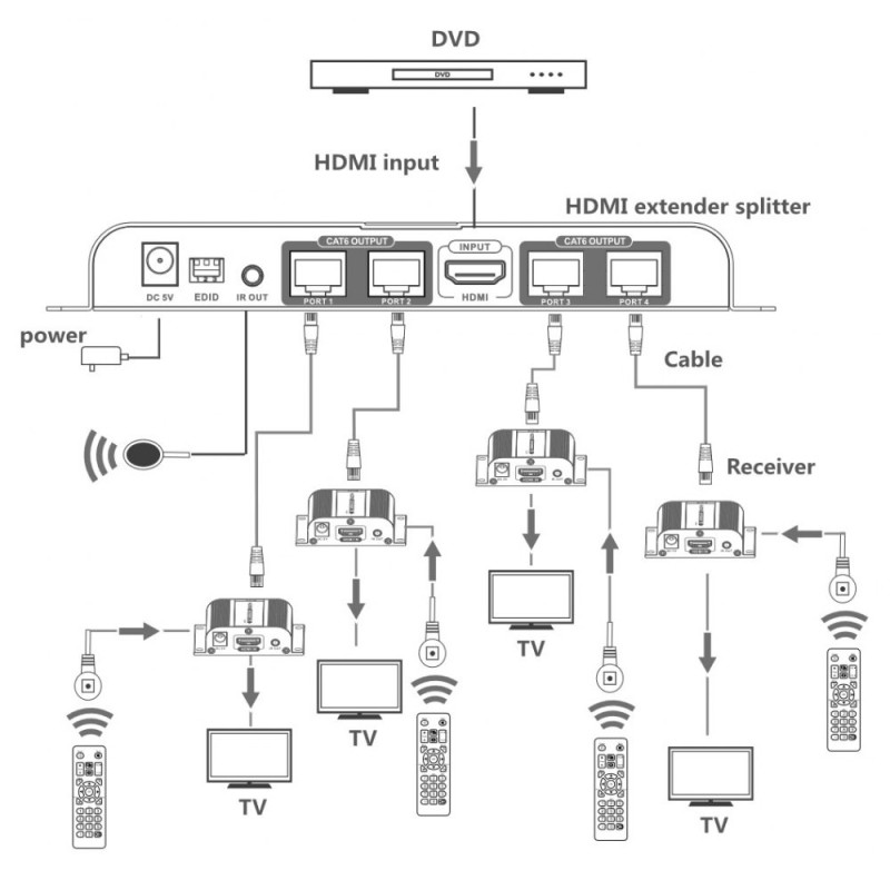 - Obsługa IR zapewnia wygodne sterowanie pilotem urządzenie źródła sygnału HDMI z lokalizacji zdalnej