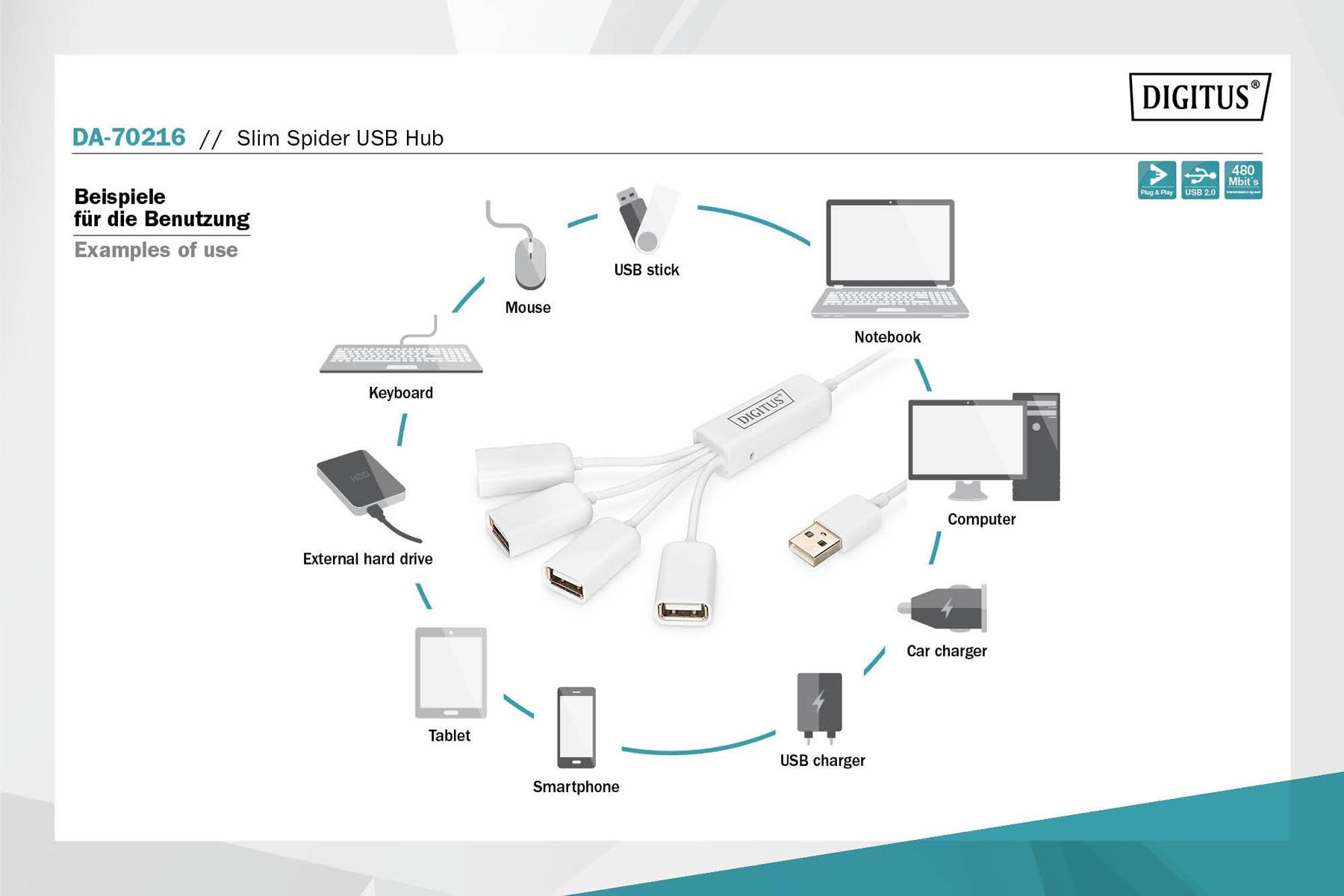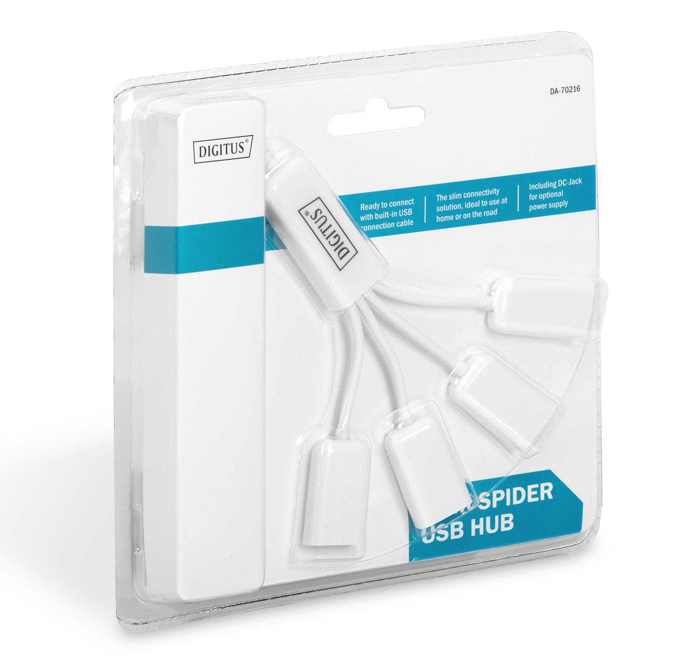 USB 2.0 Type-A marka: Digitus o parametrach: HUB/Koncentrator 4-portowy DIGITUS „Spider” USB 2.0 SuperSpeed, pasywny, Biały