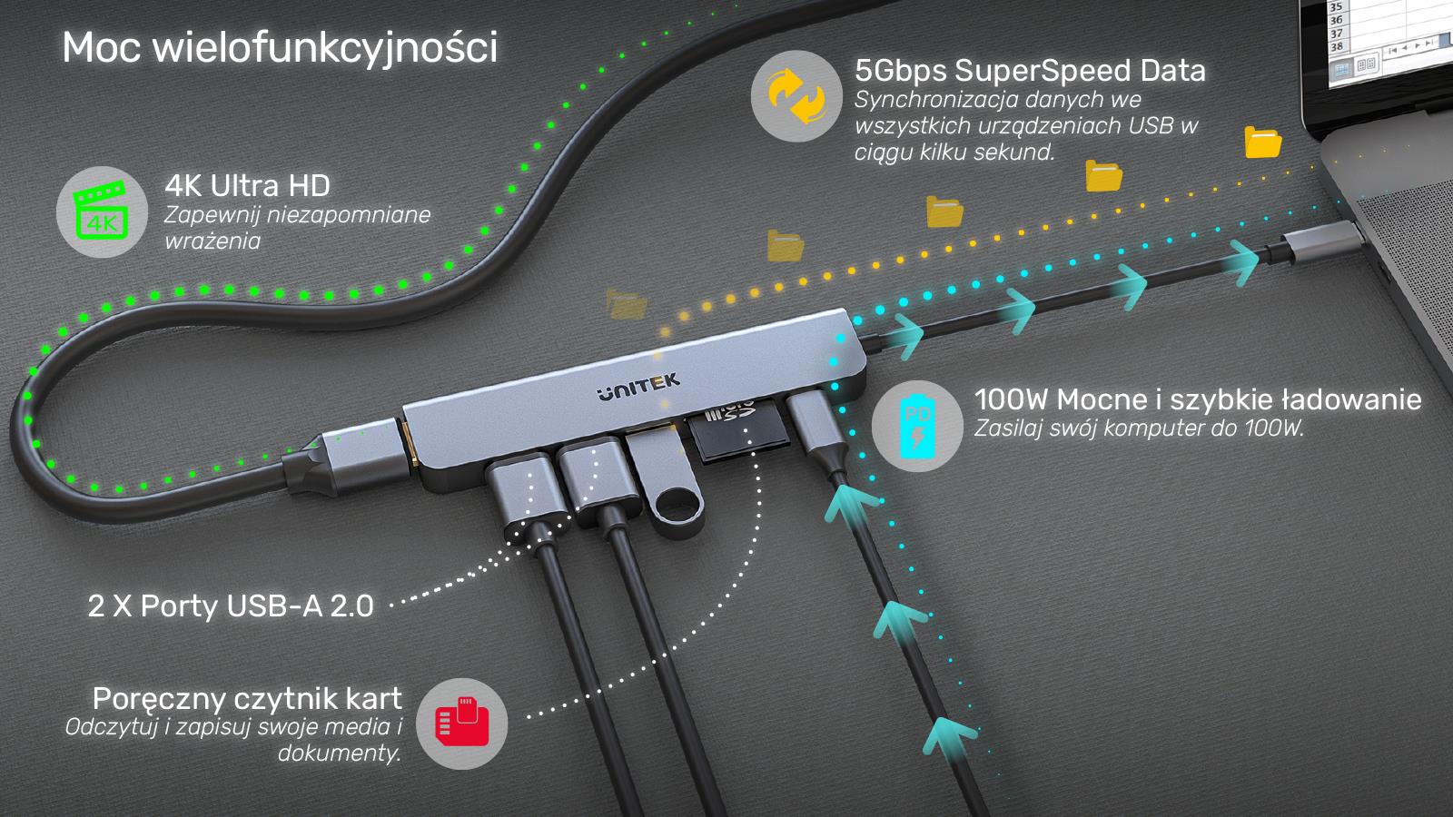 USB 3.1 Type-C marka: Unitek o parametrach: Hub USB-C Unitek H1118A 7w1, HDMI 4K, 3x USB-A, USB-C PD 100W, alu