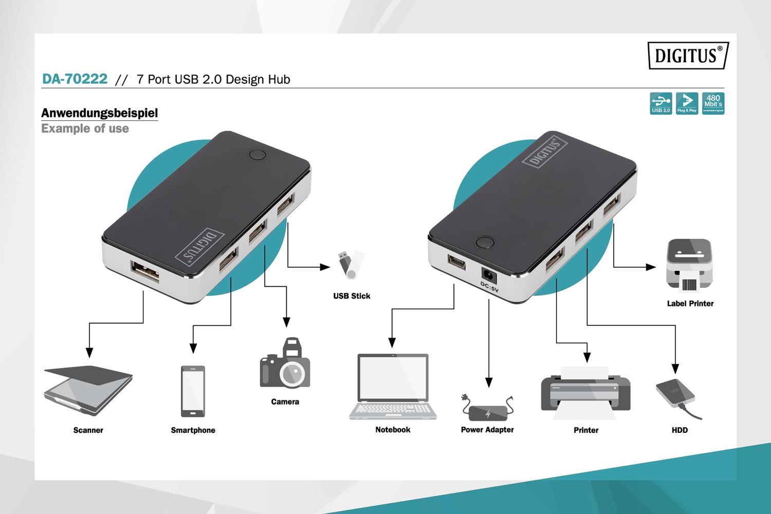 USB 2.0 marka: Digitus o parametrach: Hub USB DIGITUS DA-70222 7xUSB 2.0, aktywny, czarny