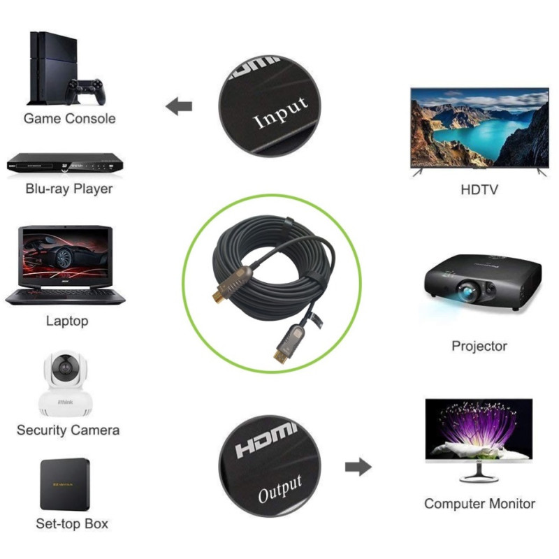 • Aktywny, hybrydowy (AOC) kabel HDMI 19-pinowy męski na HDMI 19-pinowy męski o długości 20m