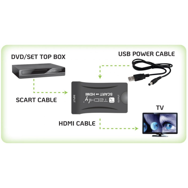 Konwerter SCART do HDMI Techly IDATA SCART-HDMI3 umożliwia podłączenie starszego typu urządzenia AV jak odtwarzacz VHS, odtwarzacz DVD czy przystawka STB do nowoczesnego telewizora z HDMI i odtwarzanie archiwalnych nagrań w jakości HD.