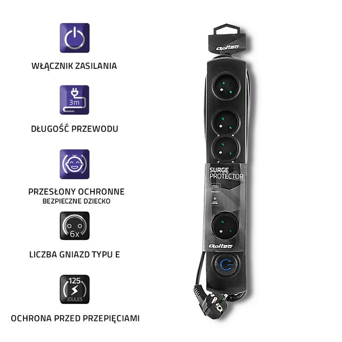 6 marka: Qoltec o parametrach: Listwa zasilająca antyprzepięciowa Qoltec 6 gniazd | 3m