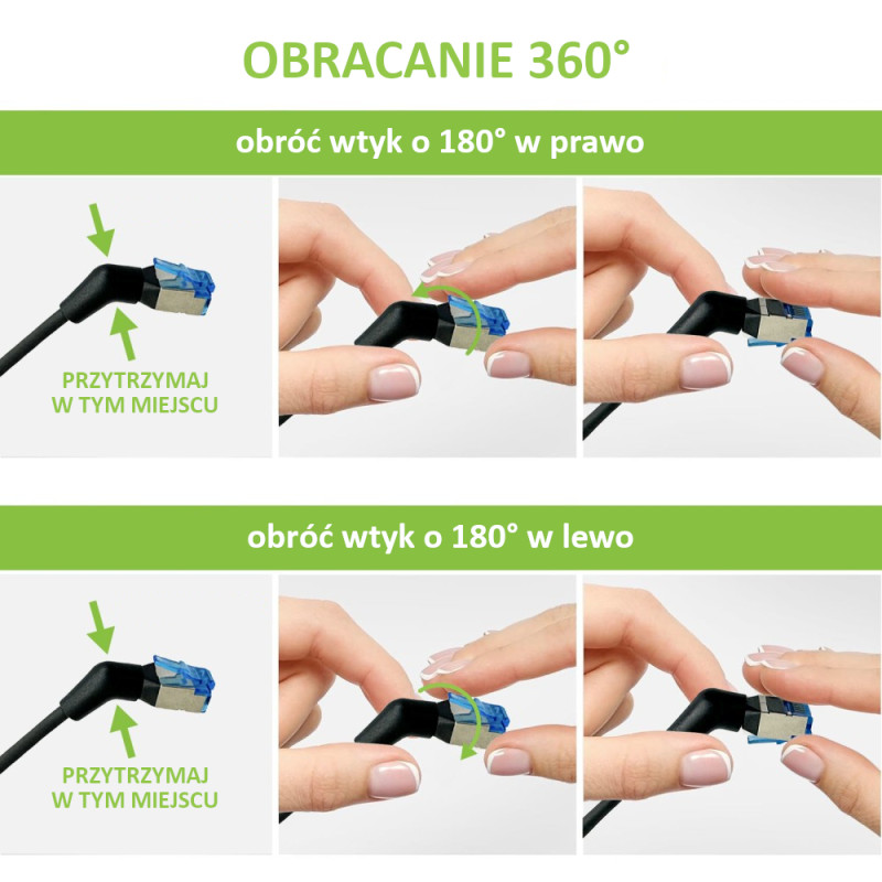 • Dwa złącza RJ45 męskie pod kątem 90° i obracane o 360°