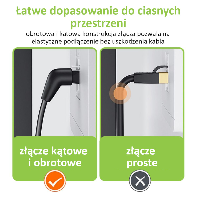 • Ultracienka i obrotowa konstrukcja sprawia, że kabel jest bardzo łatwy w użyciu i mieści się w nawet najbardziej ciasnych przestrzeniach