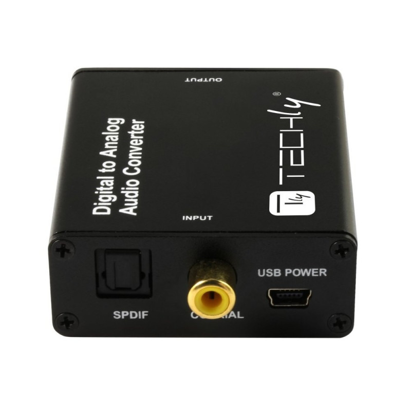 Cyfrowo-analogowy Przetwornik DAC Techly IDATA SPDIF-9 umożliwia szybką i prostą konwersję 2-kanałowego, cyfrowego dźwięku z wejścia koncentrycznego Coaxial lub wejścia optycznego Toslink (SPDIF) na analogowy dźwięk na wyjściach RCA oraz audio 3.5mm. Dzięki przetwornikowi możliwe jest przesłanie sygnału audio na przykład z telewizora poprzez złącze optyczne do wzmacniacza czy zestawu głośnikowego ze złączem RCA lub standardowych słuchawek ze złącze audio 3.5mm. Przetwornik DAC Techly pozwala na jednoczesne korzystanie z portów wyjściowych audio RCA L/R oraz audio 3.5mm.