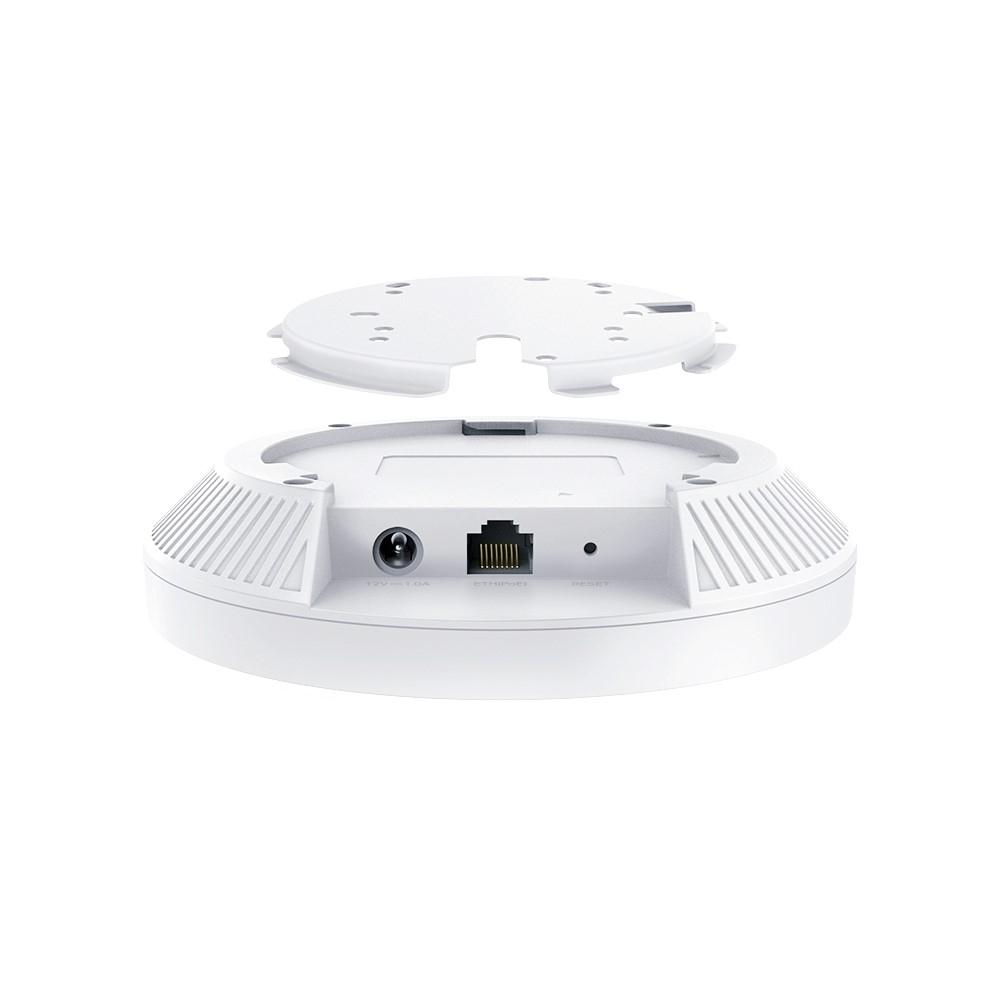 Punkt dostępowy Wi-Fi 6 oferuje ultraszybką łączność z prędkościami dochodzącymi do 2402 Mb/s w paśmie 5 GHz i 574 Mb/s w paśmie 2,4 GHz, zapewniając wydajne działanie w sieciach bezprzewodowych. Dzięki wbudowanym antenom i wysokiej mocy transmisji, gwarantuje szeroki zasięg. Obsługuje nowoczesne technologie Wi-Fi 6, takie jak HE160 i 1024-QAM, które zwiększają przepustowość i wydajność. Urządzenie wyposażono w zaawansowane funkcje, takie jak Omada Mesh i płynny roaming, a także obsługę PoE+ (standard 802.3at) dla elastyczności zasilania. Kompaktowa konstrukcja (Φ160mm x 33,6mm) i elegancki design sprawiają, że punkt dostępowy idealnie wpasuje się w każde otoczenie, a integracja z platformą Omada SDN umożliwia scentralizowane zarządzanie siecią.