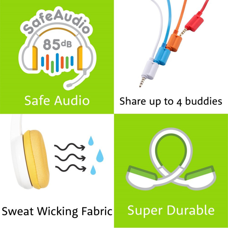 Wyobraź sobie, że nie będzie już więcej walki między dziećmi o to, kto teraz ma słuchać muzyki! Nasze ekskluzywne słuchawki BuddyPhones posiadają rozdzielacz audio o nazwie BuddyJack, który umożliwia podłączenie do jednego urządzenia audio aż do czterech par słuchawek. W praktyce oznacza to, że są to idealne słuchawki zarówno do nauki jak i dzielenia się z bliskimi swoją ulubioną muzyką lub bajką.