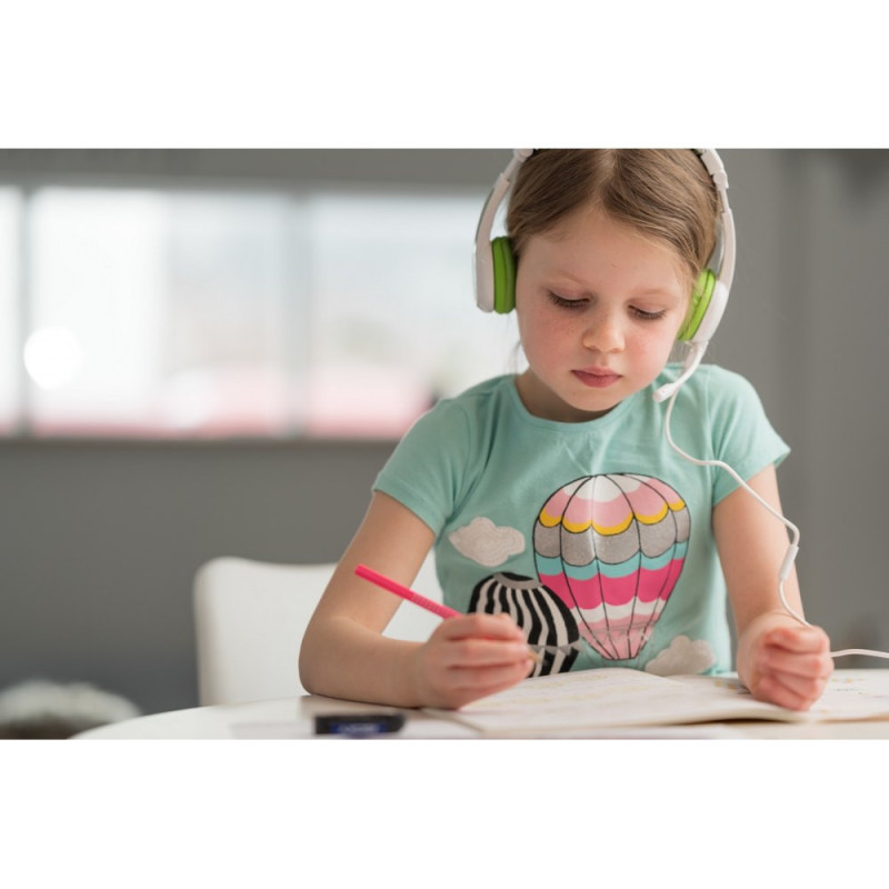 Słuchawki Dziecięce BuddyPhones z linii School+ jest najlepszym wyborem dla rodziców dzieci, które używają słuchawek w placówkach edukacyjnych lub potrzebują bezpiecznych słuchawek z mikrofonem do nauki zdalnej. Słuchawki wyposażone zostały w układ sterowania dźwiękiem, który ogranicza głośność do 85dB, czyli poziomu zalecanego jako bezpieczny dla dzieci przez Światową Organizację Zdrowia, podczas gdy wysokiej jakości mikrofon wyraźnie wychwytuje głos dziecka i minimalizuje rozpraszające hałasy w tle. Zarówno poduszka pałąka na głowę jak i poduszki nauszne wykonane zostały z miękkich, najwyższej jakości materiałów, aby zapewnić dziecku najwyższy komfort nawet podczas długotrwałego użytkowania.