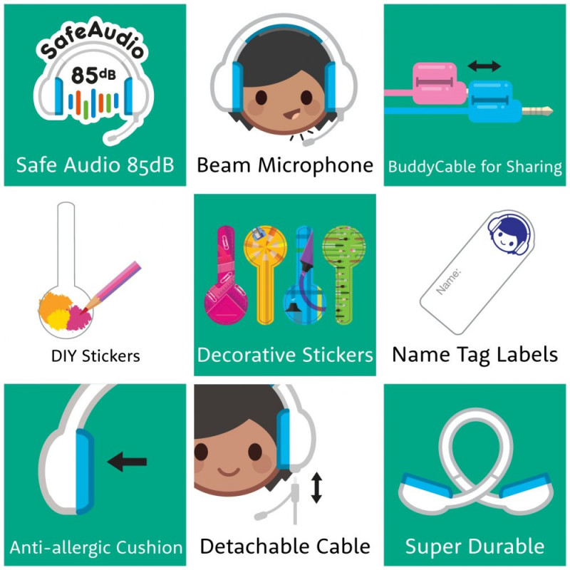 BuddyPhones® z linii StudyBuddy to podstawowa seria słuchawek dziecięcych dedykowana do nauki zdalnej. Kluczową cechą słuchawek jest odłączany mikrofon na pałąku, który dzięki dużej czułości znakomicie wychwytuje głos dziecka. Podobnie jak w przypadku innych modeli BuddyPhones® bezpieczny dla dziecka poziom głośności jest standardem i w StudyBuddy również został ograniczony do 85dB. Przycisk umieszczony na kablu zapewnia szybkie oraz swobodne odbierania i kończenie połączeń lub rozpoczęcie i zatrzymanie odtwarzania dźwięku, a zintegrowany rozdzielacz audio BuddyJack™ umożliwia podłączenie do jednego urządzenia audio aż do czterech par słuchawek. W zestawie znajdują się również kolorowe ozdobne naklejki, naklejki do samodzielnej dekoracji oraz etykiety imienne.