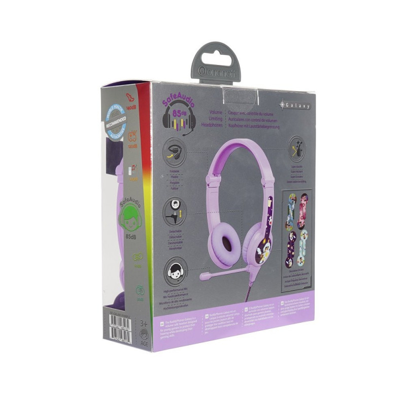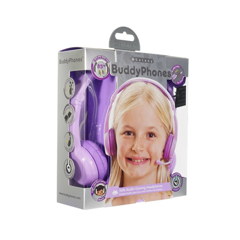 Słuchawki BuddyPhones Galaxy Purple, BP-GALAXY-PURPLE – Gamingowe Słuchawki dla Dzieci z Ograniczeniem Głośności (85dB), z Mikrofonem oraz Rozdzielaczem Audio BuddyJack
