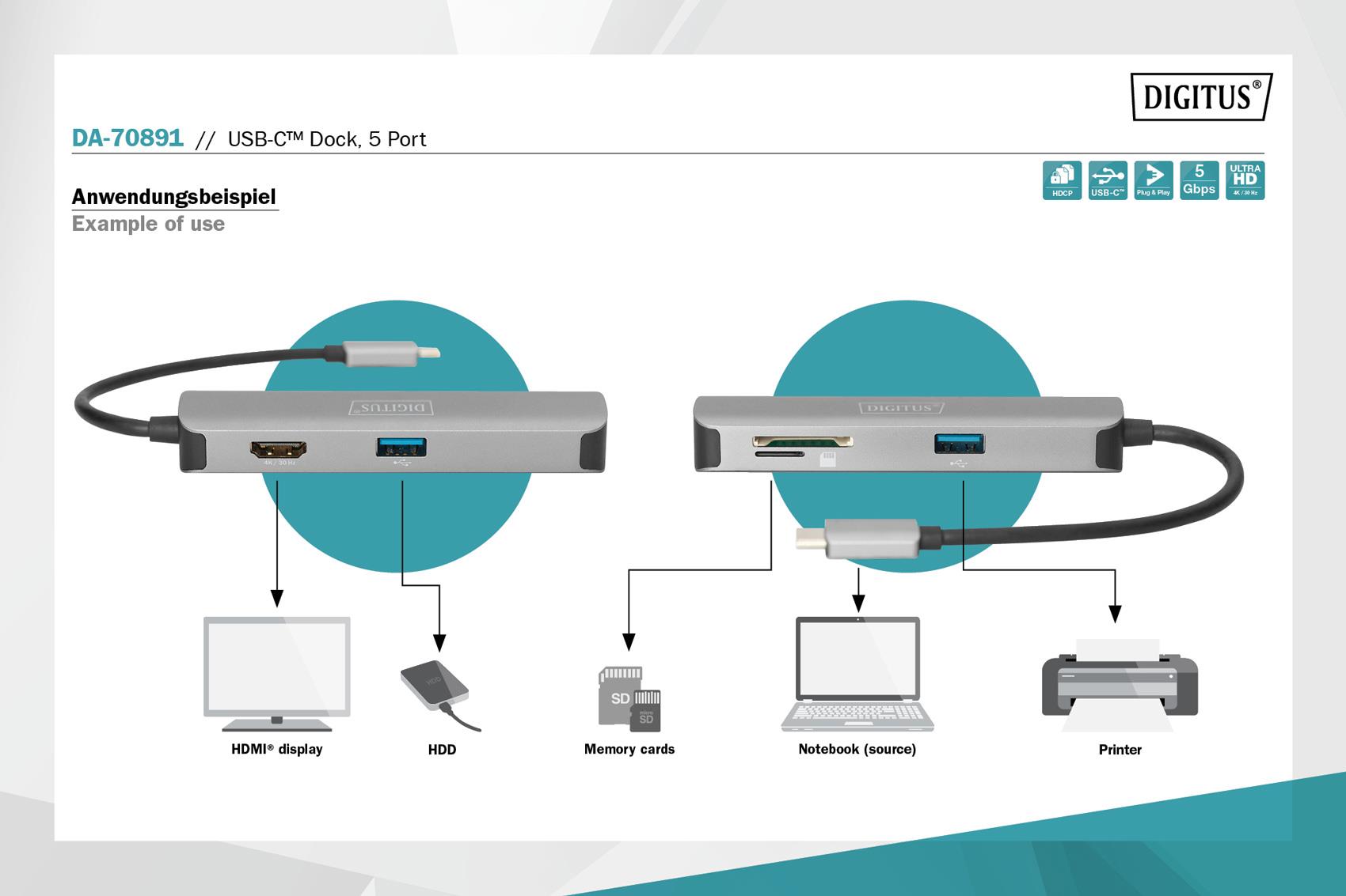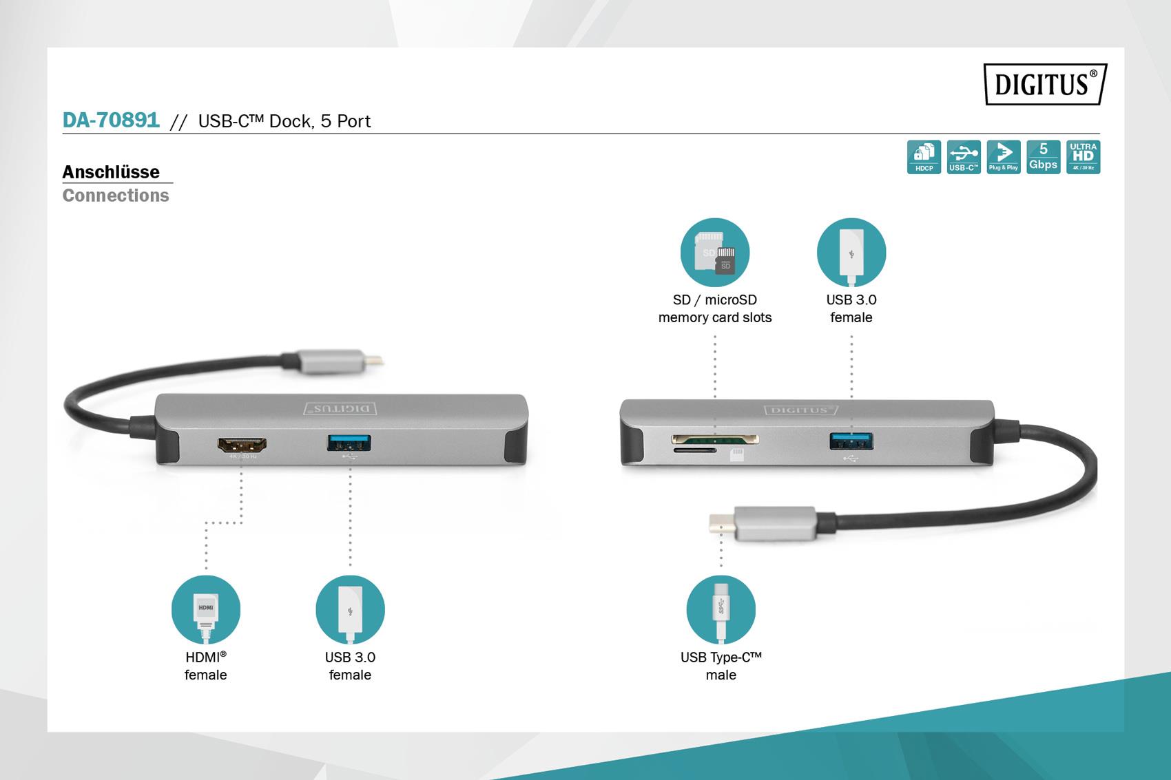 0.15 marka: Digitus o parametrach: Stacja dokująca DIGITUS USB Typ C 5 portów 4K 30Hz HDMI 2x USB3.0 microSD SD/MMC srebrna