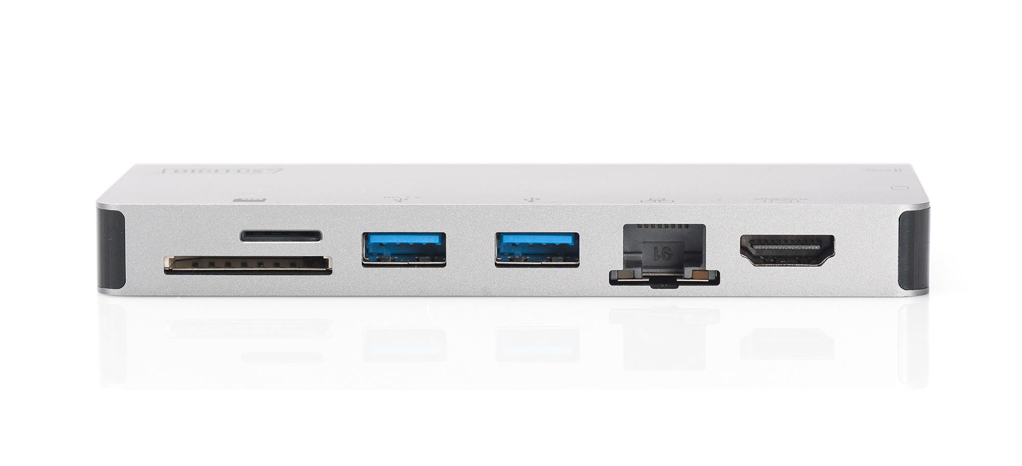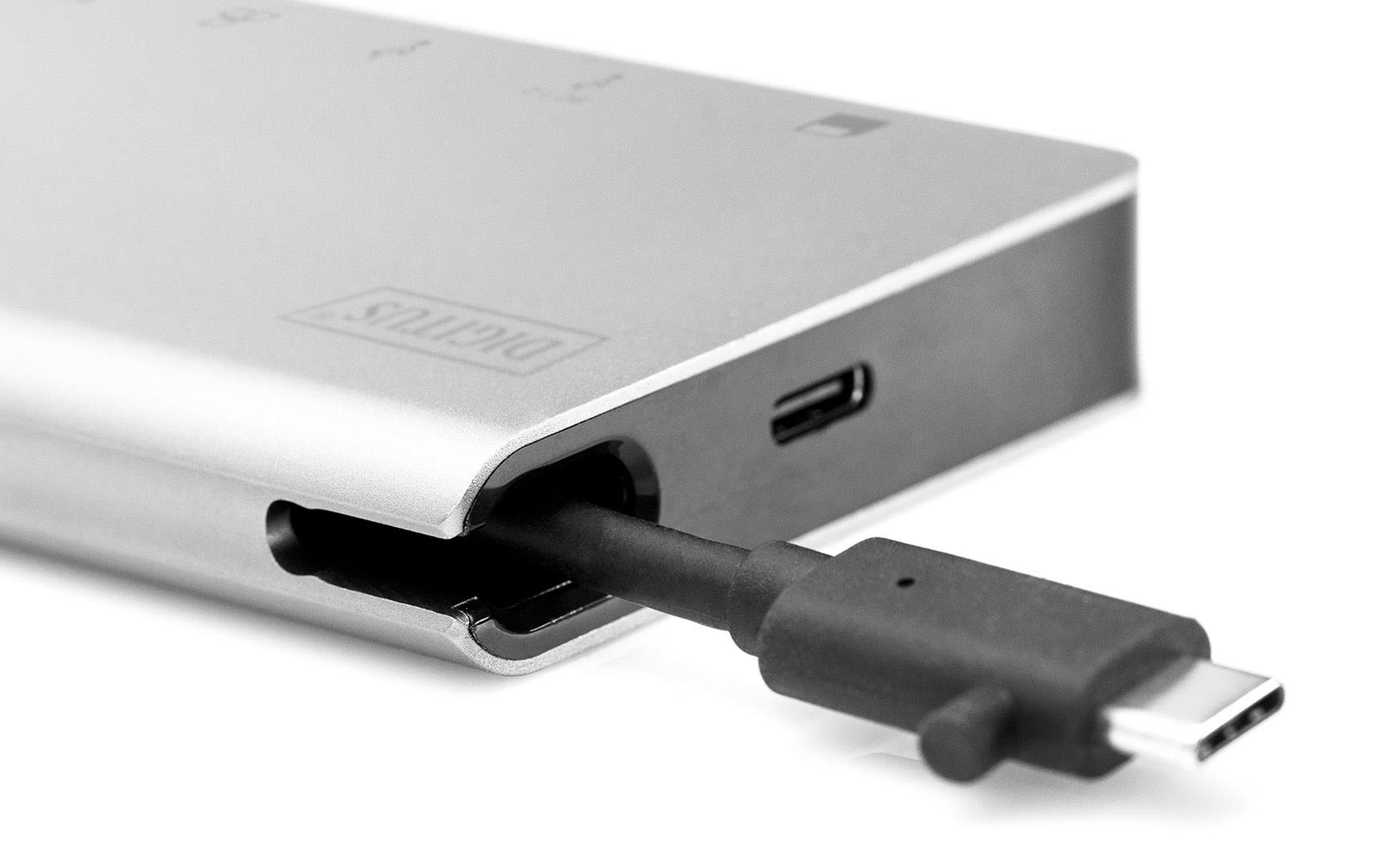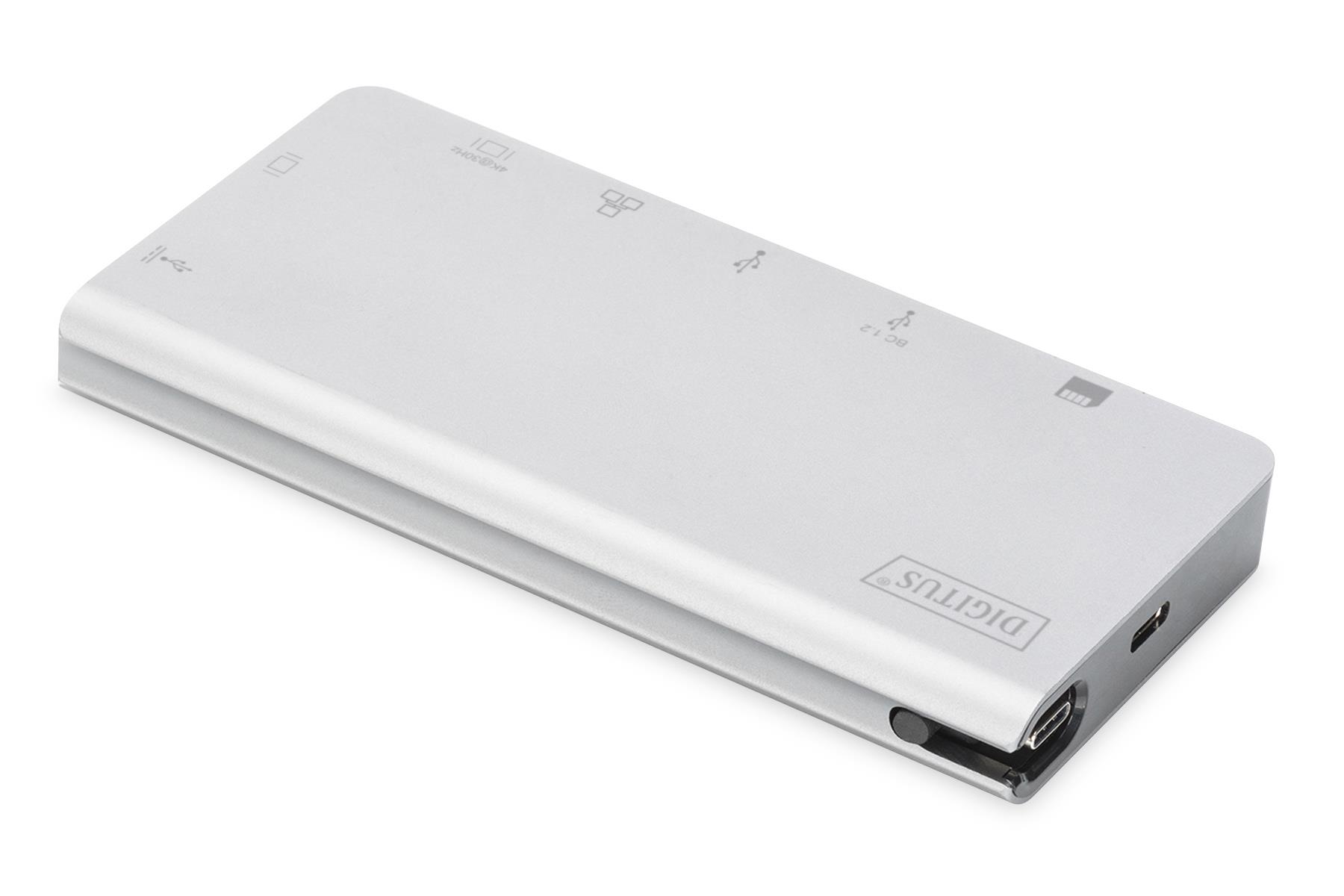 0.10 marka: Digitus o parametrach: Stacja dokująca podróżna DIGITUS USB Typ C, 8-portów 4K 30Hz, HQ, aluminiowa, srebrna