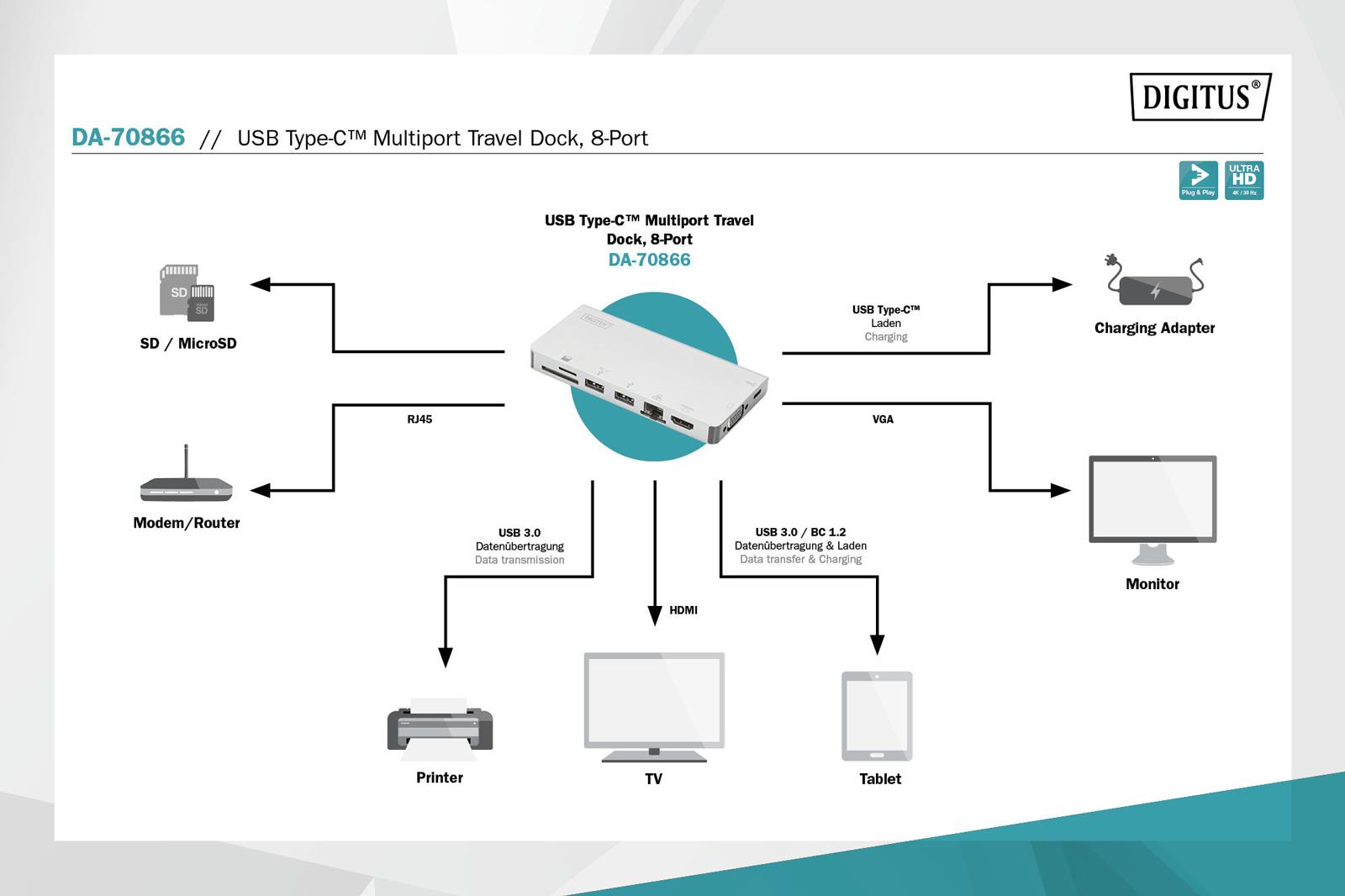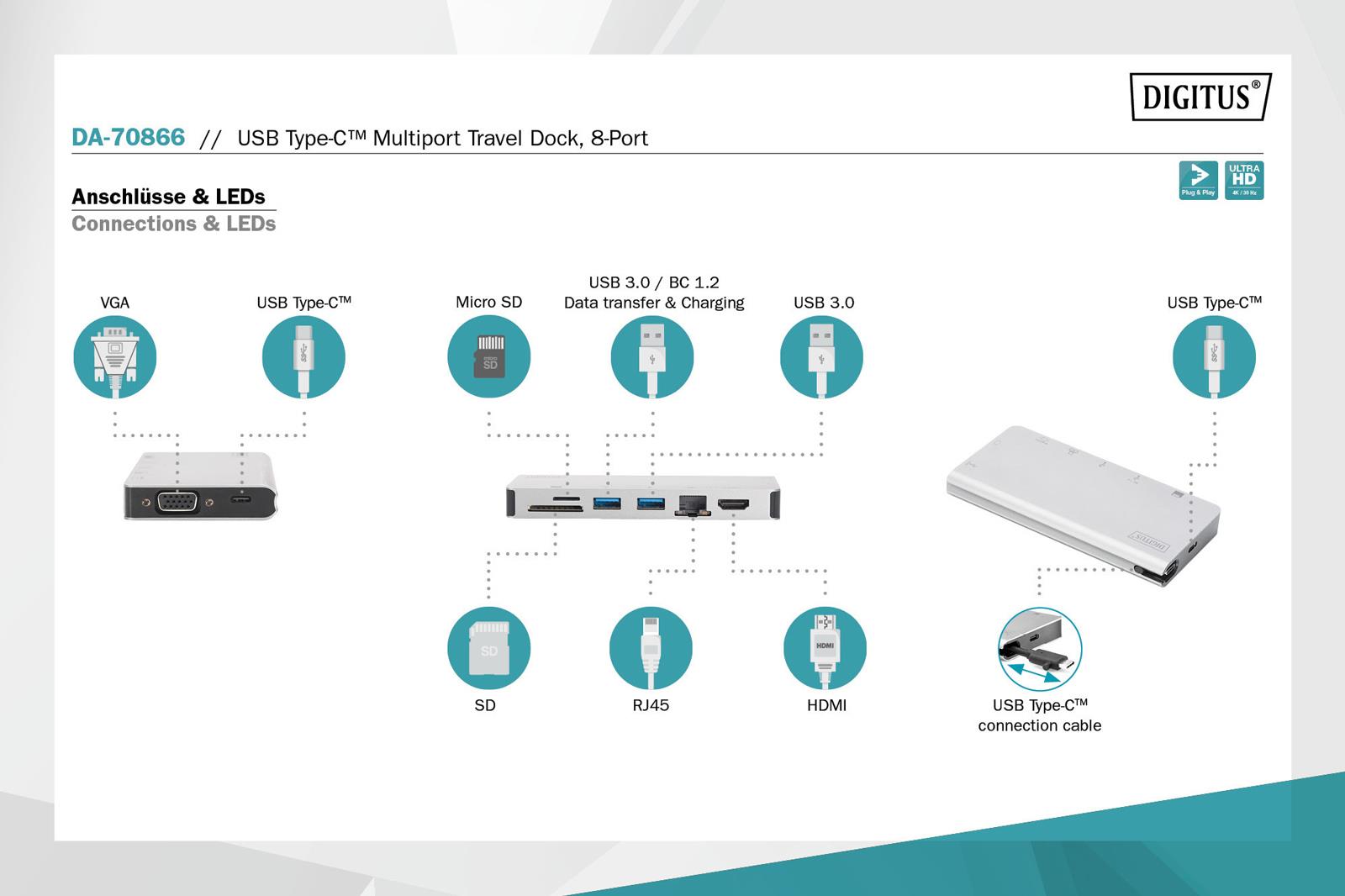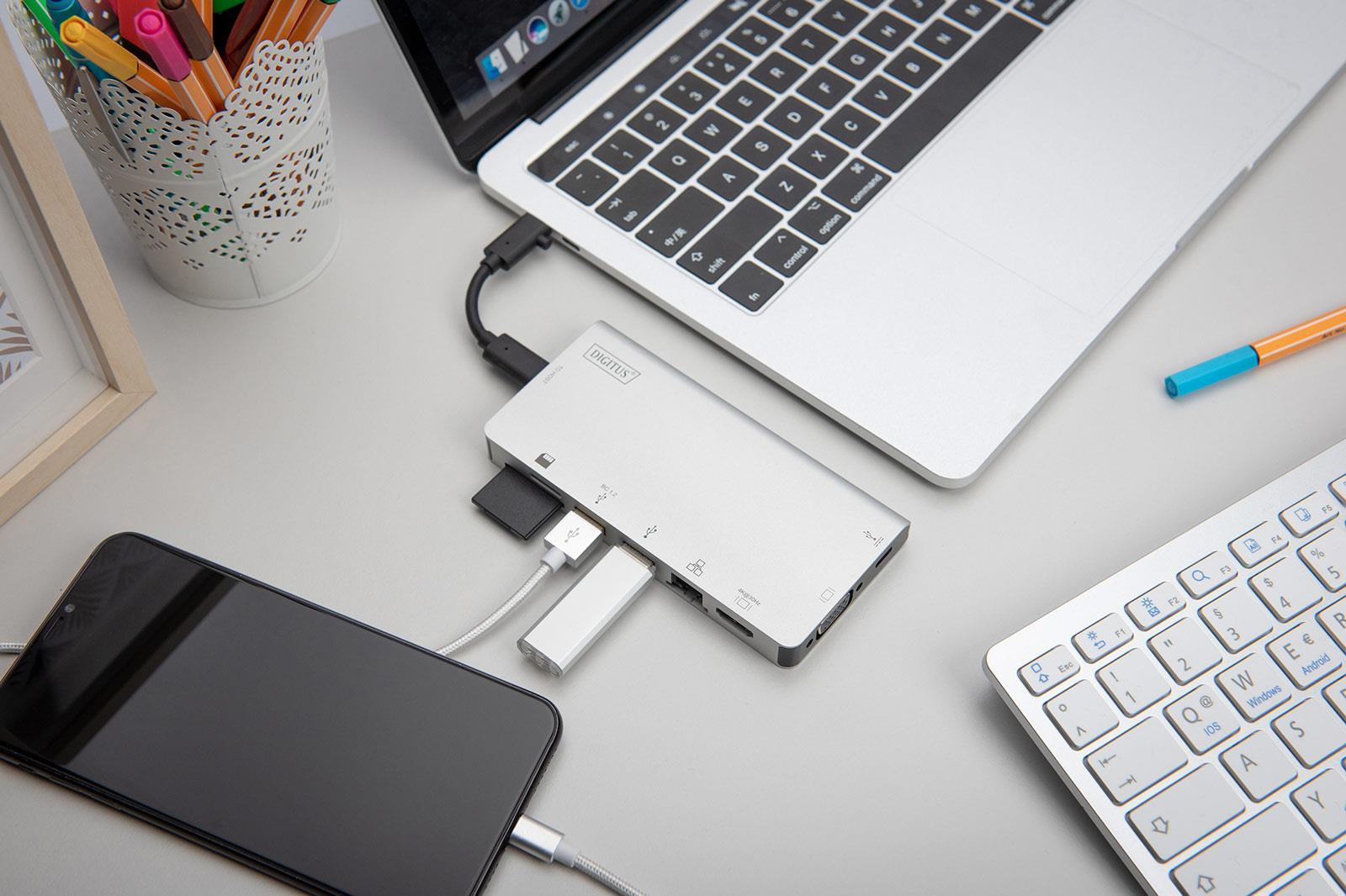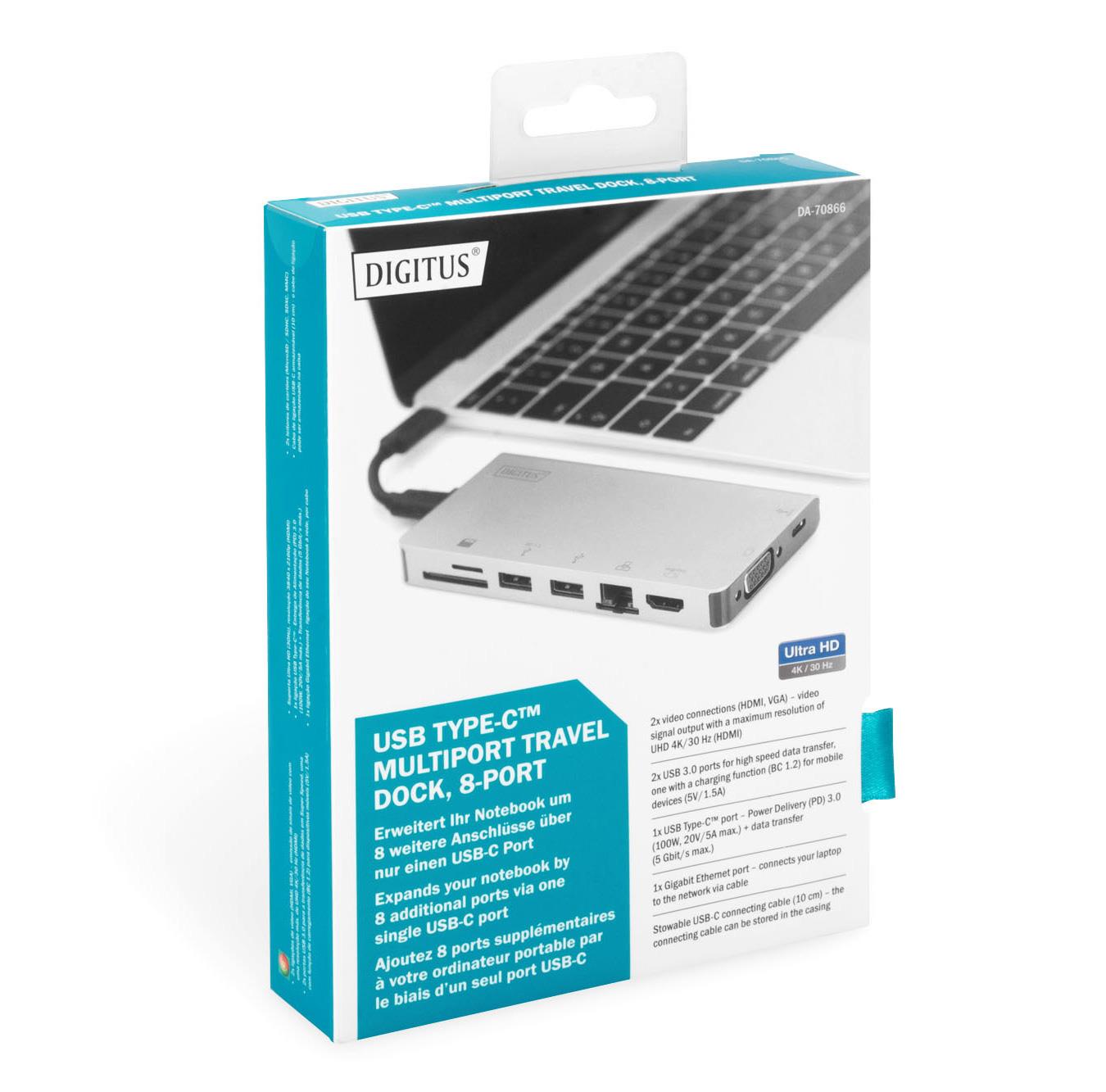 0.10 marka: Digitus o parametrach: Stacja dokująca podróżna DIGITUS USB Typ C, 8-portów 4K 30Hz, HQ, aluminiowa, srebrna