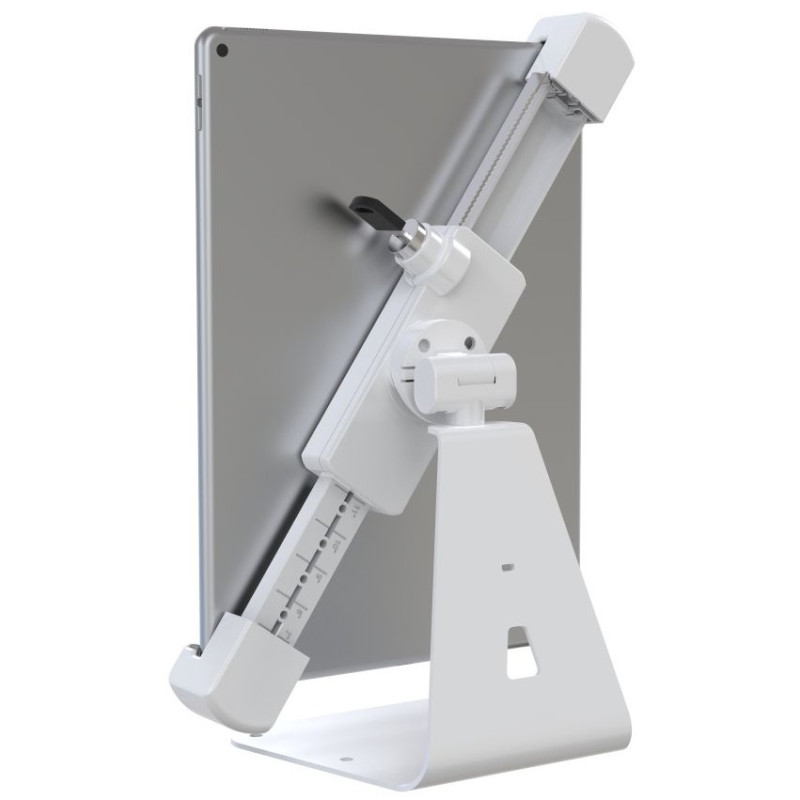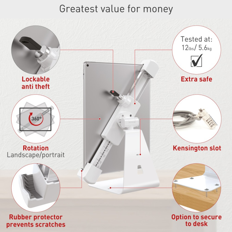 - Bezpieczeństwo: uchwyt wyposażony został w system antykradzieżowego zabezpieczenia tabletu. Zintegrowany z zaciskiem zamek pozwala na blokadę zacisku przed rozsunięciem, co uniemożliwia zdjęcie tabletu z uchwytu. W zestawie znajduje się komplet dwóch kluczy do zamku. Dodatkowymi zabezpieczeniami przed kradzieżą całego zestawu jest możliwość przykręcenia podstawki do podłoża oraz możliwość zastosowania linki zabezpieczającej standardu Kensington instalowanej w dedykowanym slocie podstawki