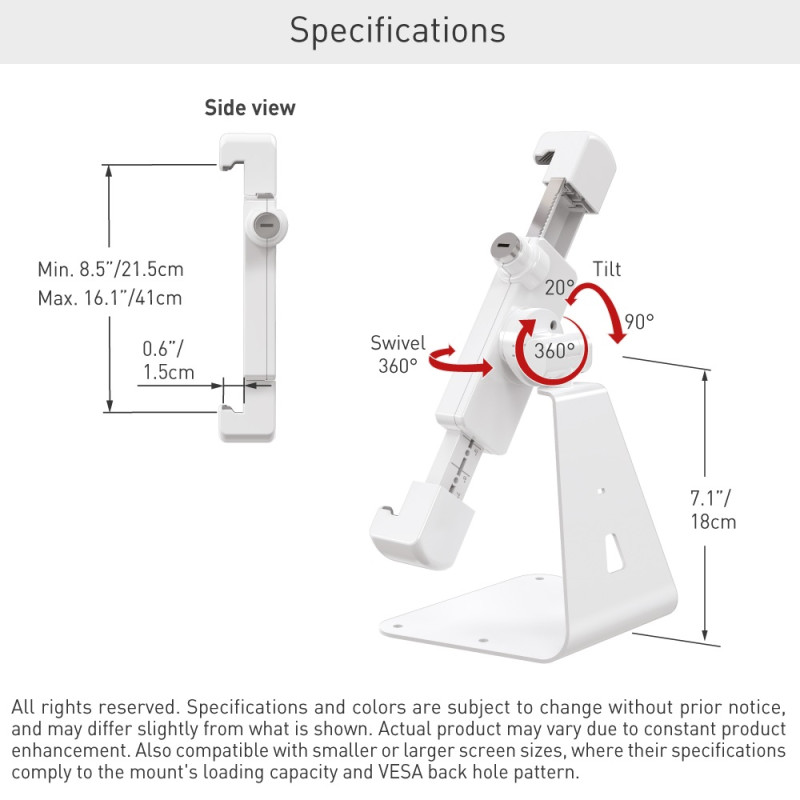 - Duża kompatybilność z tabletami: regulowana szerokość zacisku na tablet w przedziale od 21,5 do 41 cm gwarantuje bardzo dużą zgodność z wieloma modelami tabletów w rozmiarze od 7″ do 14″. Gumowe nakładki zacisków chronią tablet przed zarysowaniami oraz zapewniają stabilność i redukują ewentualne wstrząsy