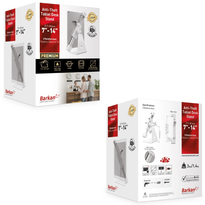 - Uniwersalne zastosowanie: konstrukcja podstawki z uchwytem tabletu 7″-14″ Barkan pozwala na jej uniwersalny montaż oraz bardzo szerokie zastosowanie. Podstawkę można ustawić w formie wolnostojącej na dowolnej płaskiej powierzchni lub przykręcić do blatu biurka czy lady recepcyjnej. Opcje zastosowanych zabezpieczeń antykradzieżowych sprawiają, że podstawka idealne nadaje się do bezpiecznego ustawienia tabletu w miejscach publicznych