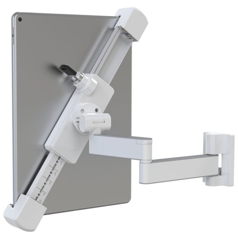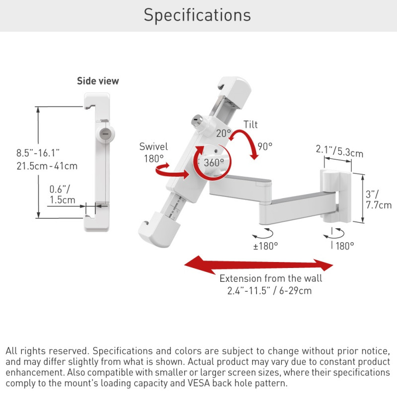 - Duży zakres regulacji: przegubowa budowa wysięgnika uchwytu na tablet z obrotową głowicą umożliwiają swobodną i beznarzędziową regulację pozycji tabletu z opcjami regulacji kąta nachylenia od -90° do +20°, skrętu prawo-lewo o ±90°, obrotu ekranu o 360° oraz regulację odległości od ściany w zakresie 60 – 290 mm