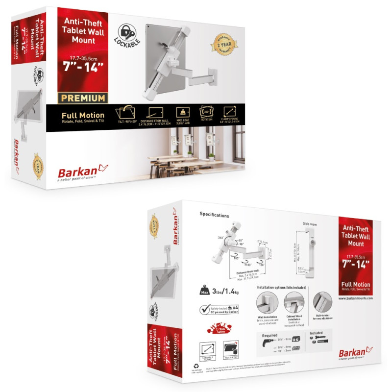 - Uniwersalne zastosowanie: konstrukcja uchwytu do tabletu 7″-14″ Barkan pozwala na jego uniwersalny montaż oraz wszechstronne zastosowanie. Uchwyt może być przymocowany do ściany, pod szafką lub blatem oraz na innej płaskiej powierzchni. Niezależnie od sposobu montażu opcje regulacji gwarantują uzyskanie za każdym razem optymalnej widoczności ekranu tabletu