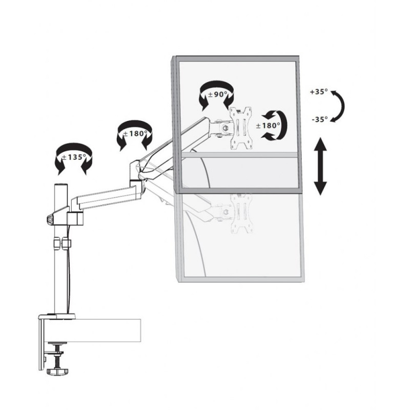 Oprócz płynnej regulacji wysokości na sprężynie gazowej uchwyt biurkowy do monitora Manhattan 461580 oferuje również funkcję regulacji kąta nachylenia wyświetlacza o ±35° jak również możliwość zmiany orientacji monitora z poziomej na pionową lub odwrotnie, czyli tak zwany PIVOT. Dodatkowym atutem uchwytu Manhattan 461580 jest opcja regulacji skrętu prawo-lewo o ±135° przy pionowym słupie oraz regulacja skrętu na przegubie o ±180°. Wszystkie opcje regulacji uchwytu biurkowego Manhattan 461580 sprawiają, że jest on idealnym rozwiązaniem do każdego zastosowania – począwszy od domowego, poprzez biurowy aż do profesjonalnych centrów monitoringu.