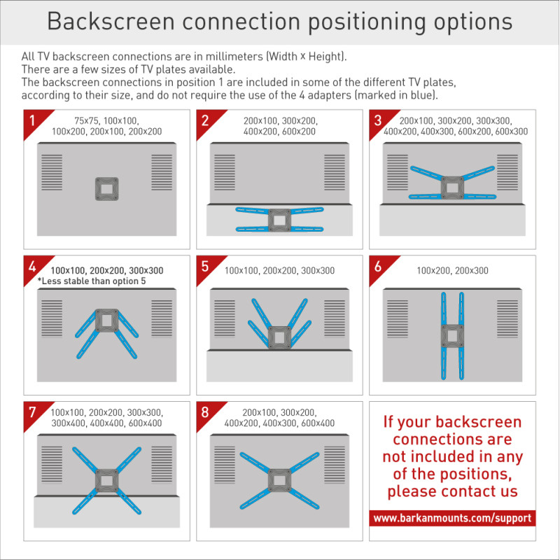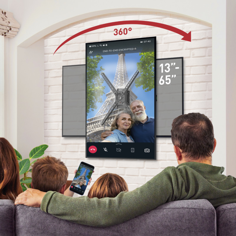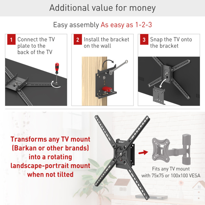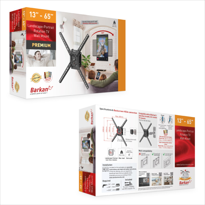 • Pionowa lub pozioma orientacja ekranu: budowa uchwytu ściennego do telewizora Barkan umożliwia beznarzędziony, szybki oraz wygodny obrót ekranu o 360° (blokada pozycji co 90°), co pozwala na swobodne ustawienie pionowej lub poziomej pozycji telewizora, w zależności od aktualnych potrzeb