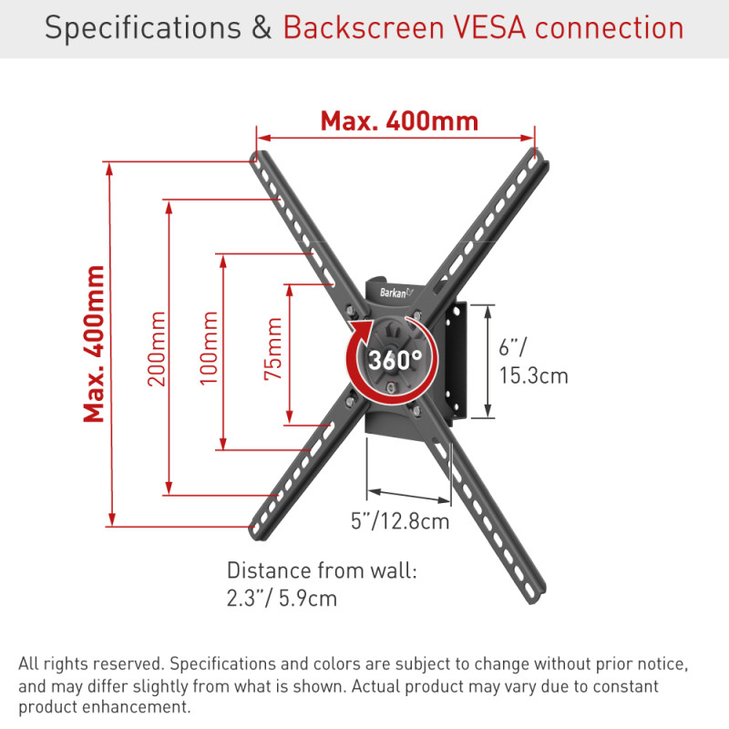 • Konstrukcja z najwyższej jakości materiałów: wszystkie produkty Barkan przechodzą testy kontroli jakości. Obrotowy uchwyt do telewizora Barkan sprostał obciążeniu 144 kg, czyli 4 krotnie większemu od deklarowanej wartości