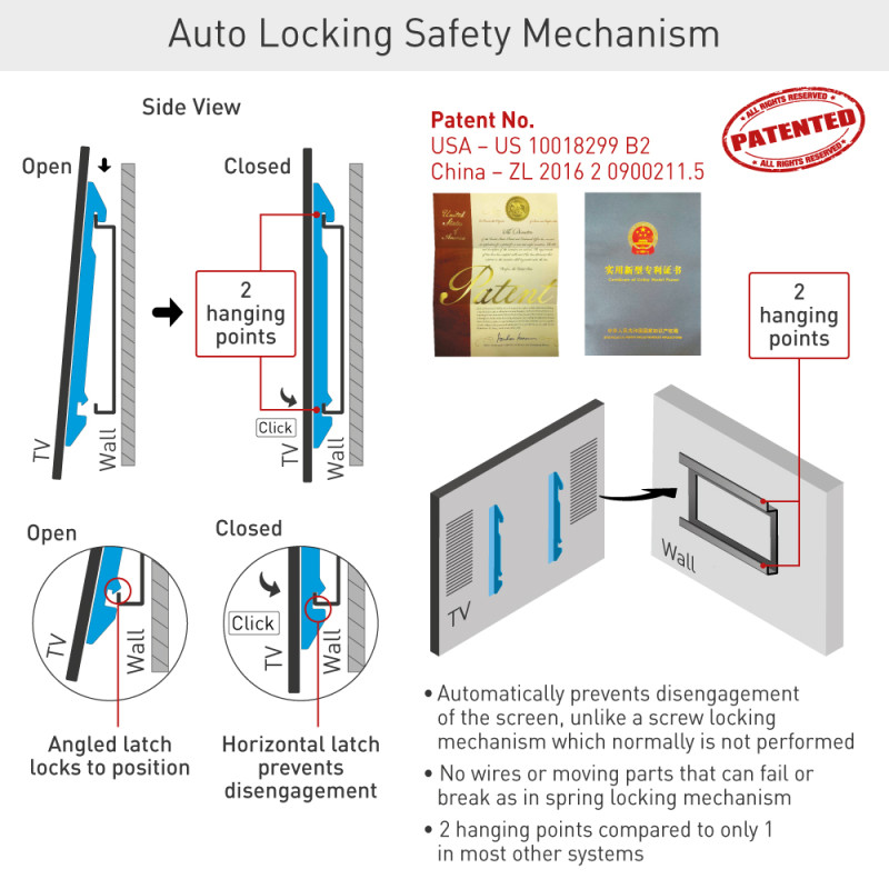 • Duża kompatybilność VESA: wspornik TV z dokręcanymi czterema uchwytami zapewnia bardzo dużą kompatybilność z ekranami z mocowaniem VESA od 75×75 do 400×400, uchwyty mogą być przykręcone w różnych konfiguracjach, co pozwala na uzyskanie niestandardowego rozstawu VESA