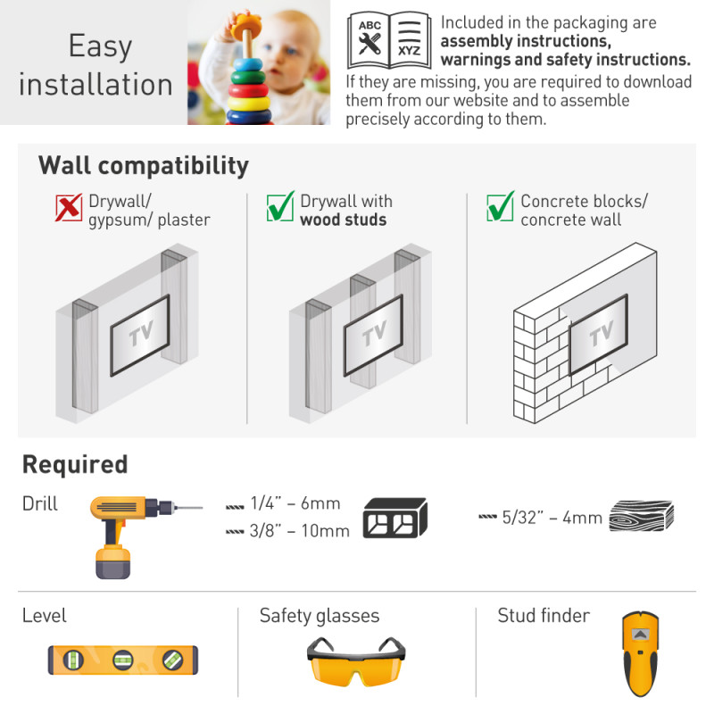 • Szybka instalacja TV na ścianie: prosta konstrukcja płyty ściennej o szerokości 13cm uchwytu TV Barkan zapewnia intuicyjny montaż ścienny (również na pojedynczych belkach lub w miejscach o ograniczonej przestrzeni) większości ekranów LED/LCD o przekątnej ekranu 13″ – 65″.