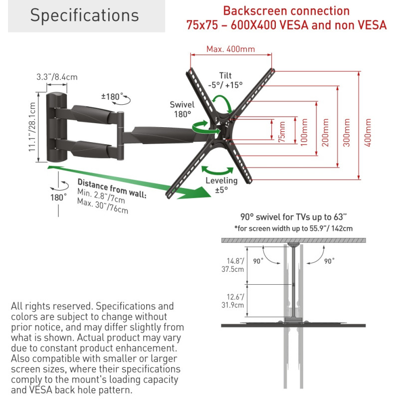 - Długi wysięgnik: po całkowitym rozłożeniu do długości 76cm pozwala na pełen skręt 90° prawo-lewo telewizorów o przekątnej ekranu do 63″ (lub szerokości do 142 cm)