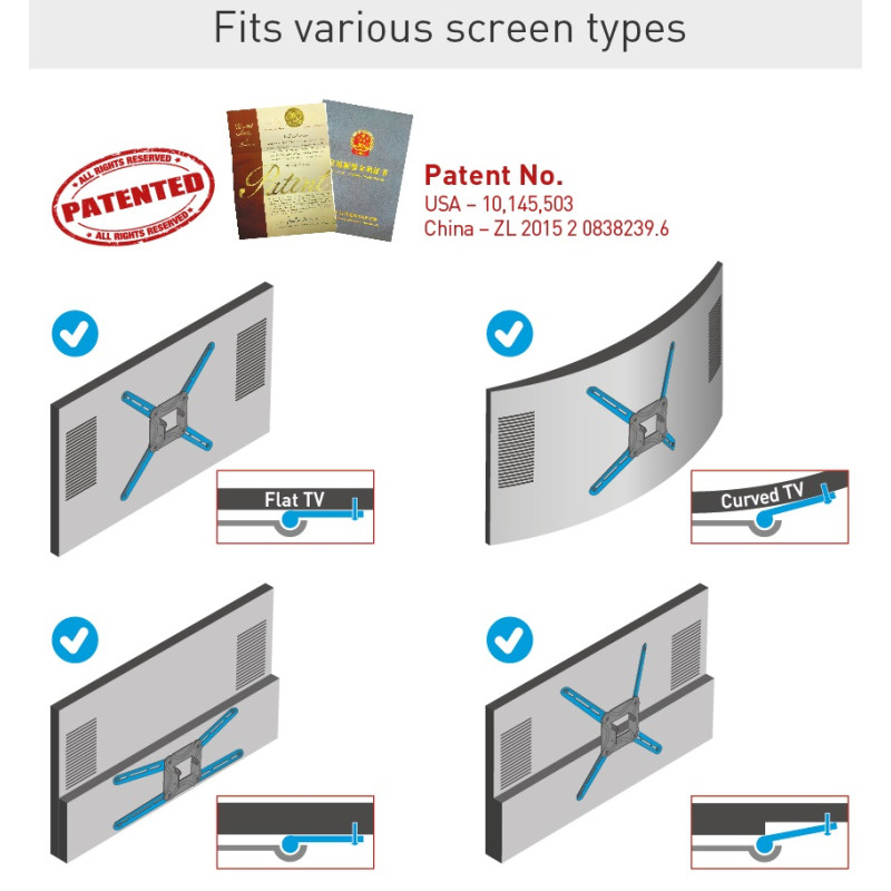 - Szerokie zastosowanie: opatentowane rozwiązania zastosowane w obrotowym uchwycie ściennym TV Barkan pozwalają na instalację zarówno płaskich i zakrzywionych ekranów, jak i takich z nieregularnym kształtem panelu tylnego