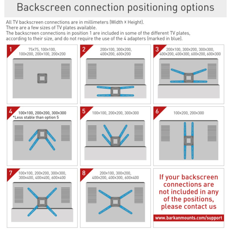 | Standard VESA | 75×75; 100×100; 100×200; 200×100; 200×200; 200×300; 300×200; 300×300; 300×400; 400×200; 400×300; 400×400 |
