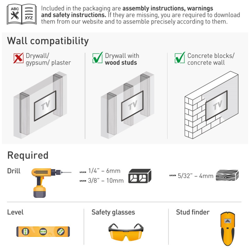 - Bogate wyposażenie: wraz z uchwytem do telewizora Barkan w zestawie znajdują się elementy montażowe, w tym kołki i śruby do montażu ściennego oraz różne warianty rozmiarowe śrub, podkładek i dystansów do telewizora