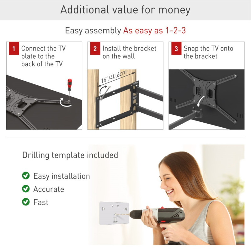 • Szybka instalacja: prosta konstrukcja płyty ściennej uchwytu pozwala na niezwykle szybki oraz intuicyjny montaż ścienny większości ekranów LED/LCD o wielkości 13-83”