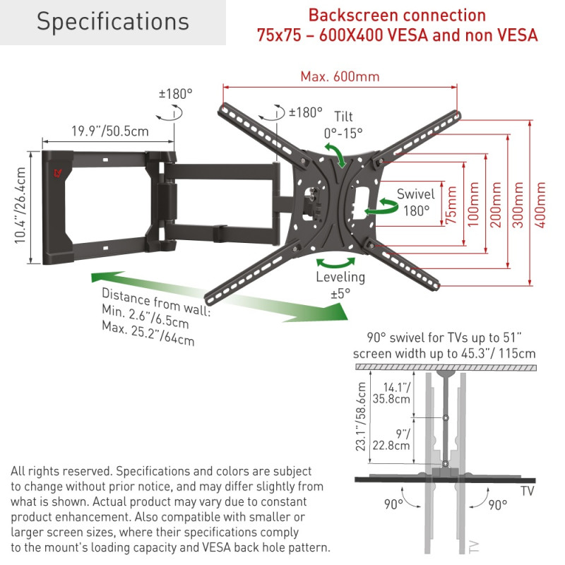 • Długi wysięgnik: po całkowitym rozłożeniu do długości 64cm pozwala na pełen skręt 90° prawo-lewo telewizorów o przekątnej ekranu do 50″ (lub szerokości do 115 cm)