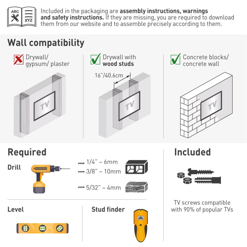 • Bogate wyposażenie: wraz z uchwytem do telewizora Barkan w zestawie znajdują się elementy montażowe, w tym kołki i śruby do montażu ściennego oraz różne warianty rozmiarowe śrub, podkładek i dystansów do telewizora