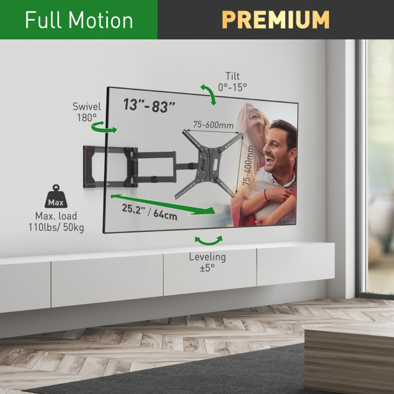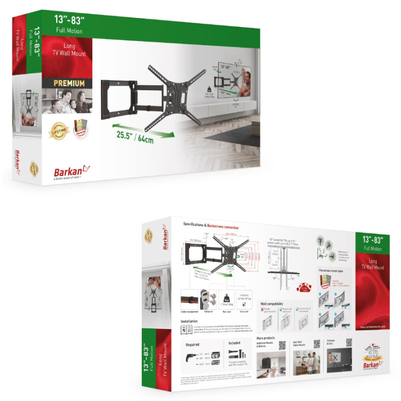• Pełna regulacja widoczności ekranu: budowa typu Full-Motion uchwytu Barkan z 3 przegubami pozwala na swobodną regulację odległości od ściany w zakresie 6,5 do 64 cm, regulację skrętu na przegubach o ±90°/±180°, beznarzędziową regulację nachylenia od 0° do 15° oraz korektę poziomu po instalacji o ±5°