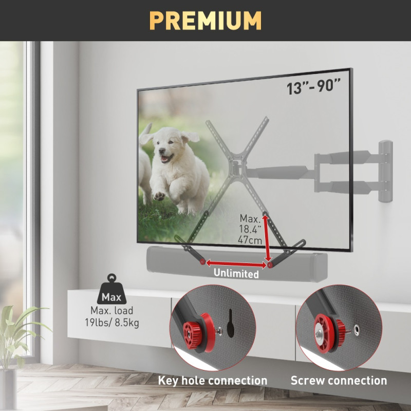 • Szeroka kompatybilność: dwa niezależne wsporniki o regulowanej konstrukcji gwarantują bardzo dużą zgodność zarówno z różnymi modelami telewizorów jak i głośnikami Soundbar o zróżnicowanej szerokości otworów montażowych