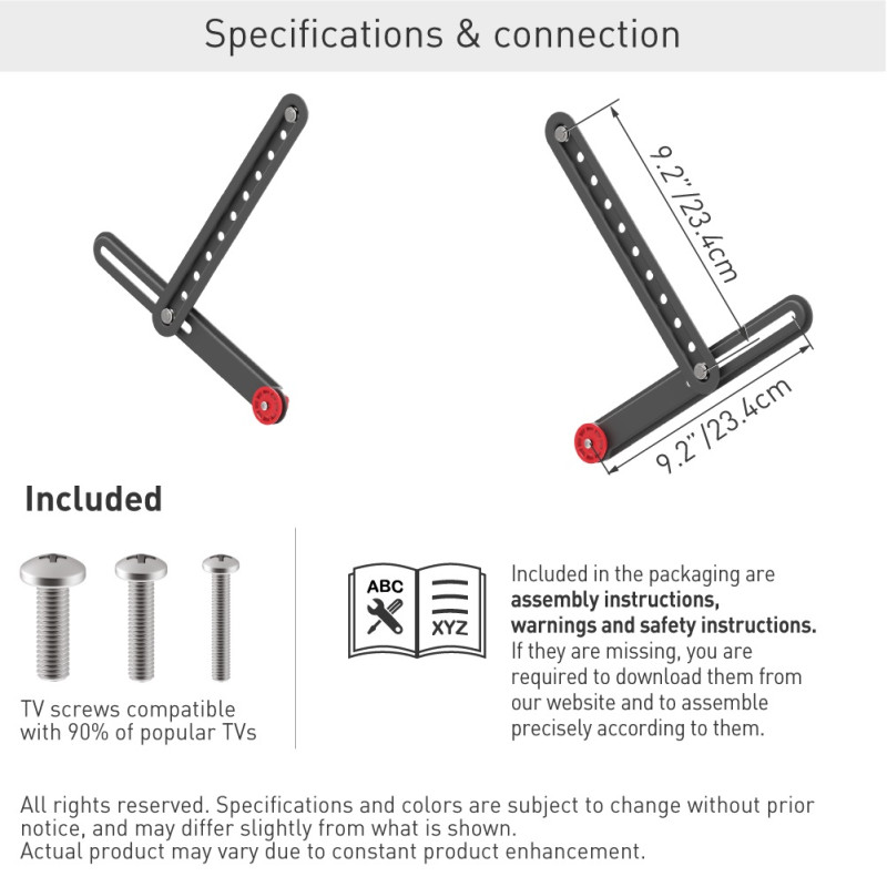 • Regulacja: regulowana odległość pomiędzy punktami mocowania w telewizorze (lub uchwycie) oraz głośniku Soundbar w zakresie około 4 do 47 cm pozwala na zastosowanie uchwytu z telewizorami o różnej wielkości oraz głośnikami o różnym rozstawie otworów montażowych